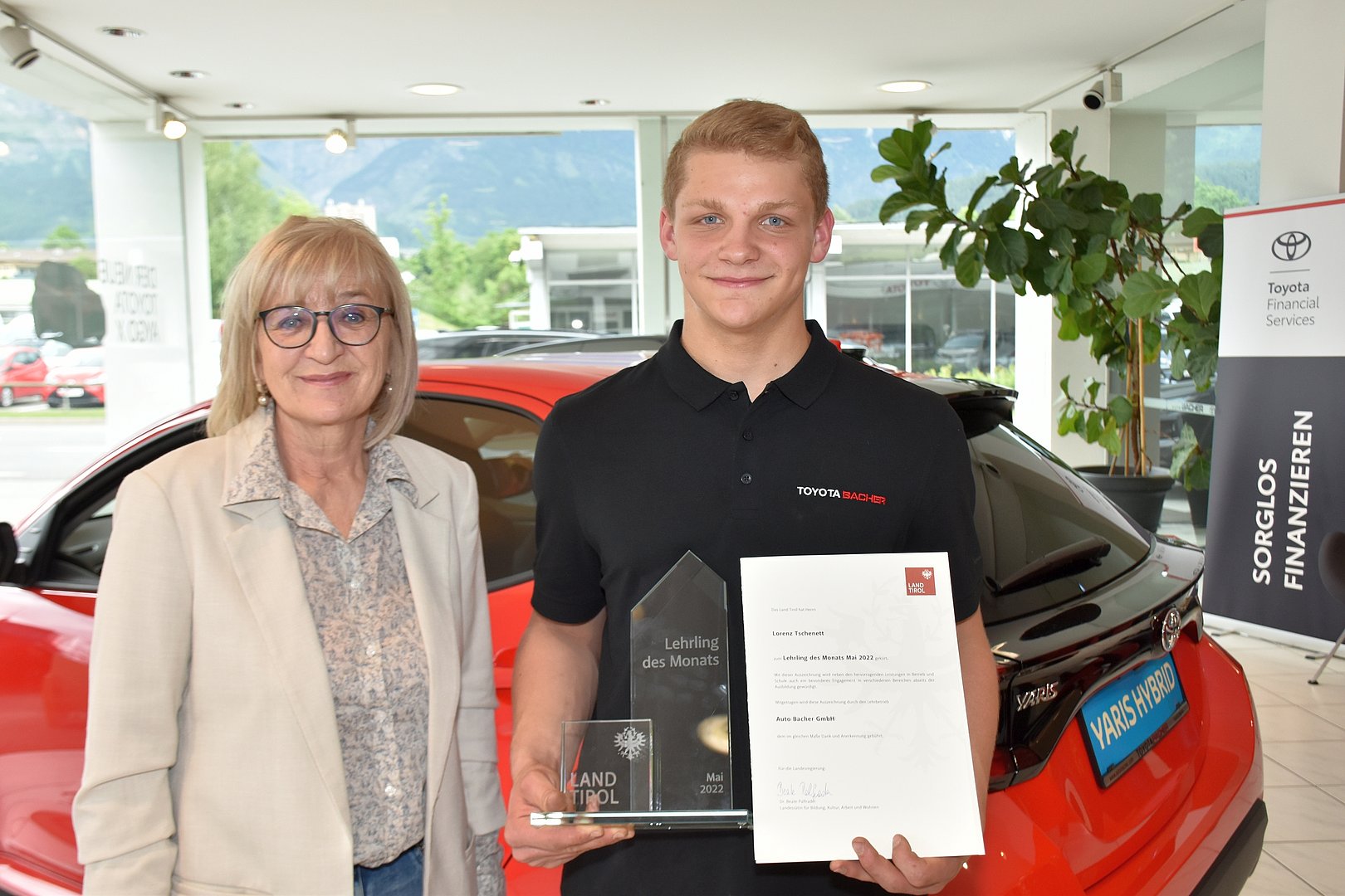 Über ganz Tirol verteilen sich die zwölf „Lehrlinge des Monats“: Der „Lehrling des Monats Mai 2022“ heißt Lorenz Tschenett, kommt aus Baumkirchen und absolviert eine Lehre zum Kraftfahrzeugtechniker im dritten Lehrjahr bei der Auto Bacher GmbH in Hall in Tirol. Bildungs- und Arbeitslandesrätin Beate Palfrader überreichte bei einem Besuch im Betrieb persönlich die Lehrlingsauszeichnung an den jungen Burschen.