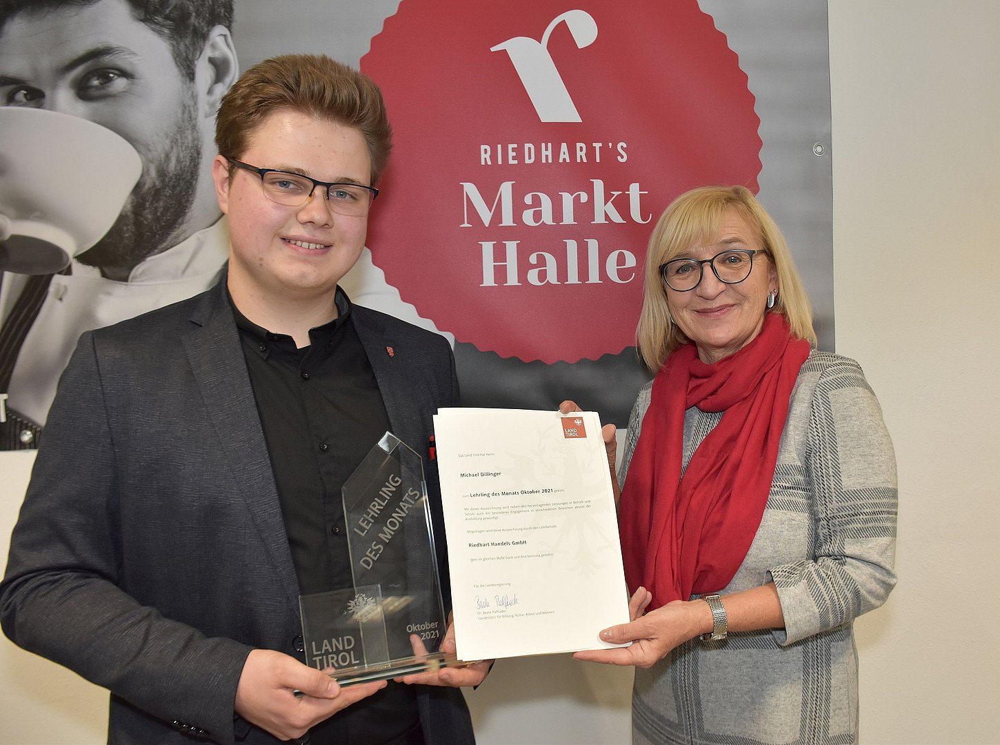 Der „Lehrling des Monats Oktober 2021“ heißt Michael Dillinger, kommt aus Ebbs und absolviert eine Lehre zum Informationstechnologen-Technik im vierten Lehrjahr bei der Firma Riedhart Handels GmbH in Wörgl. Bildungs- und Arbeitslandesrätin Beate Palfrader überreichte bei einem Auszeichnungstermin im Betrieb persönlich unter Einhaltung der aktuellen Covid-Sicherheitsvorgaben die Glastrophäe und die Urkunde an den engagierten Lehrling.