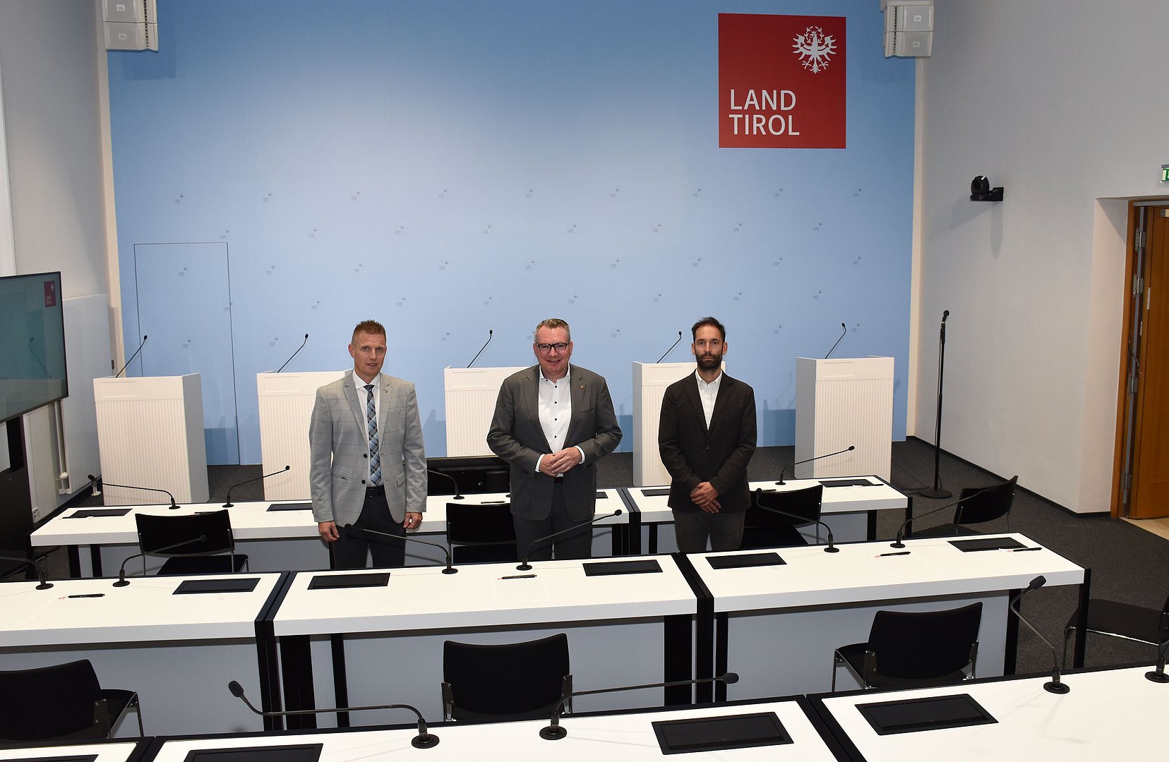 Heute, Donnerstagvormittag, wurde der neue Medienraum des Landes Tirol von dem für Hochbau und Liegenschaften des Landes zuständigen Landesrat Johannes Tratter offiziell vorgestellt: „Es freut mich, die Medienvertreterinnen und -vertreter in Zukunft im neu gestalteten Medienraum begrüßen zu dürfen, nachdem die Medientermine coronabedingt längere Zeit im Großen Saal stattgefunden haben. Mit heutigem Tag werden die neu konzipierten und zeitgemäßen Räumlichkeiten mit modernster Technik für Medientermine wieder genutzt“, so der Landesrat, der weiter ausführt: „Nachdem sich im August 2019 aufgrund eines Baumangels Teile der Deckenkonstruktion gelöst hatten, wurden die erforderlichen Instandsetzungsmaßnahmen erhoben sowie mit Adaptierungen, die dem aktuellen Nutzungsbedarf entsprechen, begonnen. Das Ergebnis kann sich sehen lassen – damit ist der Medienraum des Landes am Puls der Zeit. An dieser Stelle gilt mein Dank der Abteilung Hochbau, der Abteilung Liegenschaftsverwaltung sowie der Abteilung Öffentlichkeitsarbeit des Landes für die sorgfältige Planung und Umsetzung des Projektes.“