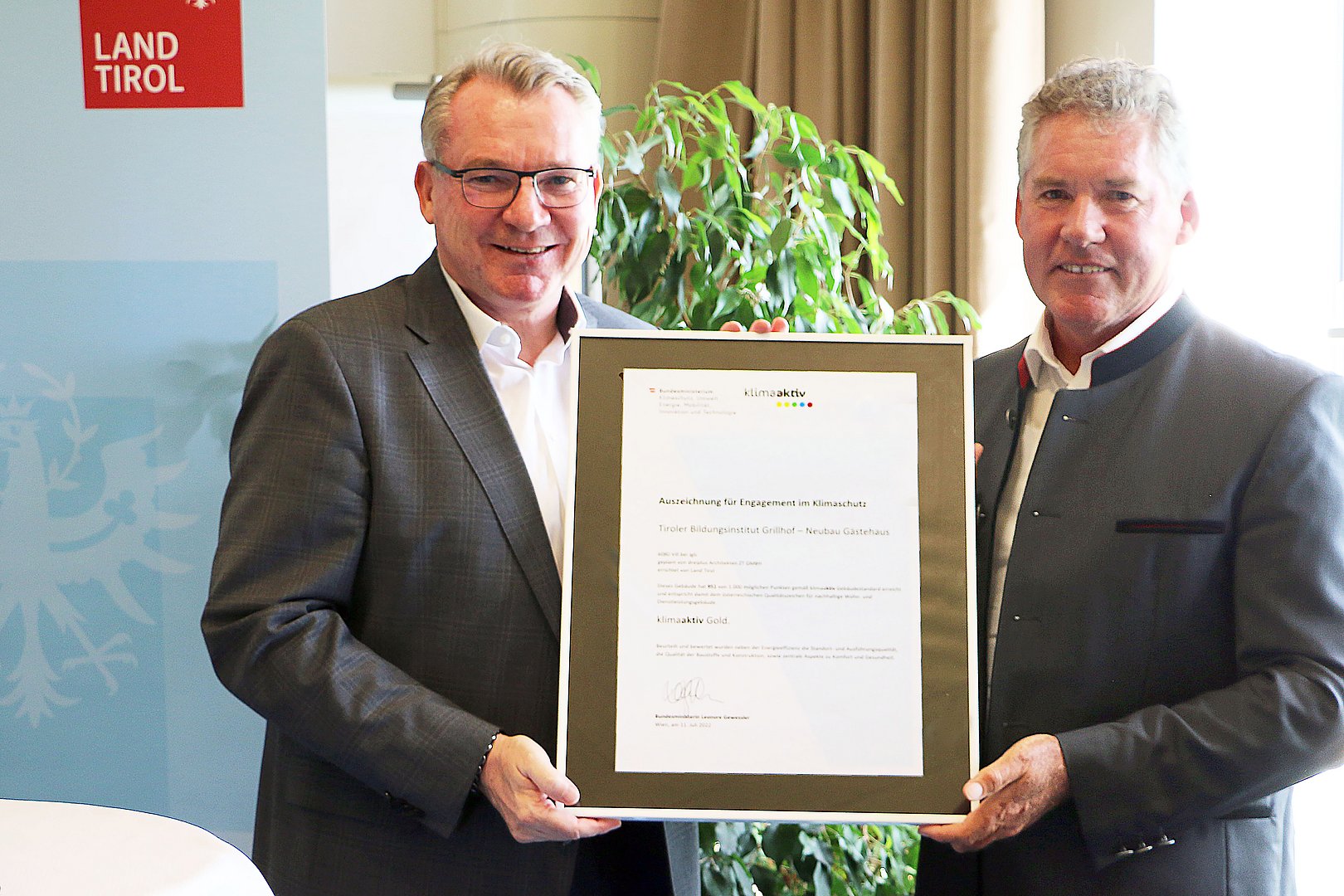 Sowohl bei der Planung als auch bei der Ausführung des Baus wurde auf eine besonders ökologische Materialwahl und die Vermeidung schadstoffreicher Chemikalien geachtet. „Allein durch die gewählte Holzbauweise wurden im Vergleich zu einem reinen Betonbau 156 Tonnen an CO2 eingespart. Zur Einordnung: Um 156 Tonnen CO2 zu binden, bedarf es umgerechnet rund 60 ausgewachsener Fichten. Damit jedoch nicht genug: Für den langfristig ressourcenschonenden und nachhaltigen Betrieb des Gästehauses wurde eine Wärmepumpe mit Tiefenbohrung errichtet. Ergänzt wird das nachhaltige Energiekonzept durch die Mitnutzung der bereits am Dach des Haupthauses installierten Photovoltaikanlage, sowie der thermischen Solaranlage, welche die Warmwasseraufbereitung übernimmt“, freut sich LR Tratter über das nachhaltige Vorzeigeprojekt. „Nachhaltiges Planen, ressourcenschonendes Bauen und energieeffiziente Nutzung tragen nicht nur zur Energieunabhängigkeit unseres Landes, sondern auch zum Klimaschutz bei. Das Land Tirol hat hier eine Vorbildwirkung, welcher wir – wie hier am Grillhof – in vielen Projekten im ganzen Land nachkommen. Denn nur so können wir unser Ziel, die Energieautonomie 2050, erreichen.“