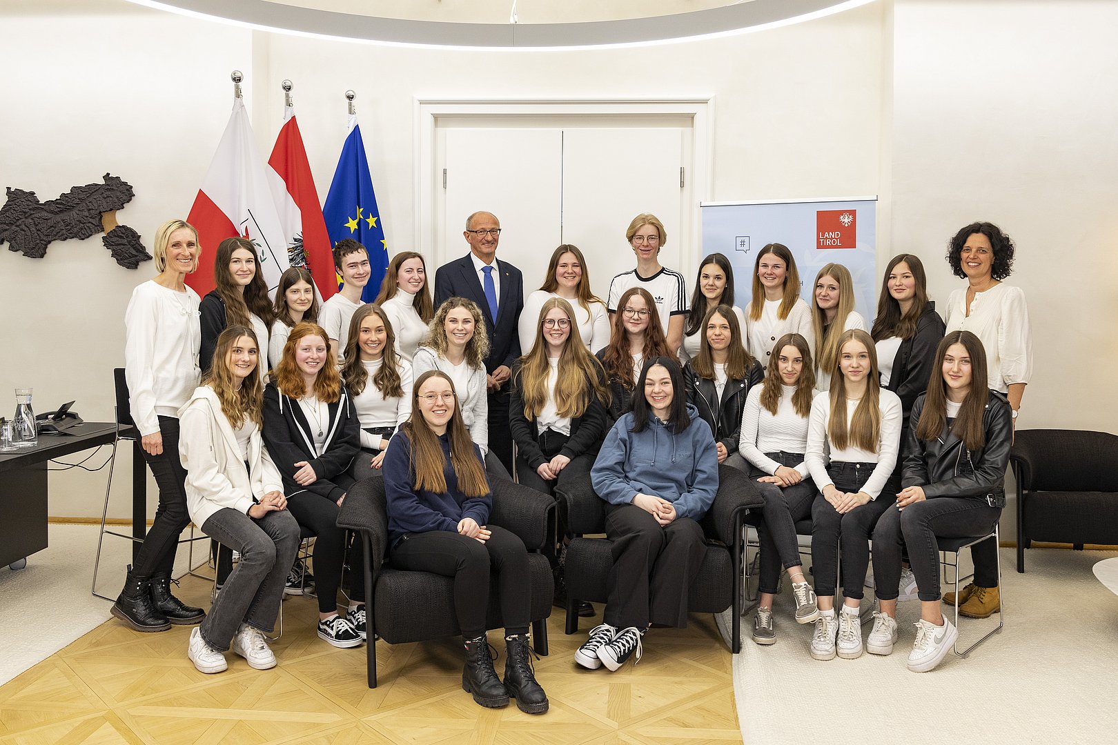 Im Rahmen der März-Ausgabe von „Frag den LH“ empfing LH Anton Mattle die Klasse 3A der Bildungsanstalt für Elementarpädagogik (BAfEP) Zams in seinem Büro im Innsbrucker Landhaus. „Es ist immer ein tolles Erlebnis, junge Menschen bei mir im Büro zu begrüßen und mit ihnen über aktuelle Themen und ihre Anliegen zu diskutieren. Es ist mir ein besonderes Anliegen, Politik für die Tirolerinnen und Tiroler greifbar zu machen und die Ideen junger Menschen in meine Arbeit als Landeshauptmann einfließen zu lassen“, betont LH Mattle und fährt fort: „Die Diskussion mit den Schülerinnen und Schülern der BAfEP Zams war spannend und hat einmal mehr gezeigt, dass sich Jugendliche intensiv mit gesellschaftspolitischen Themen auseinandersetzen.“