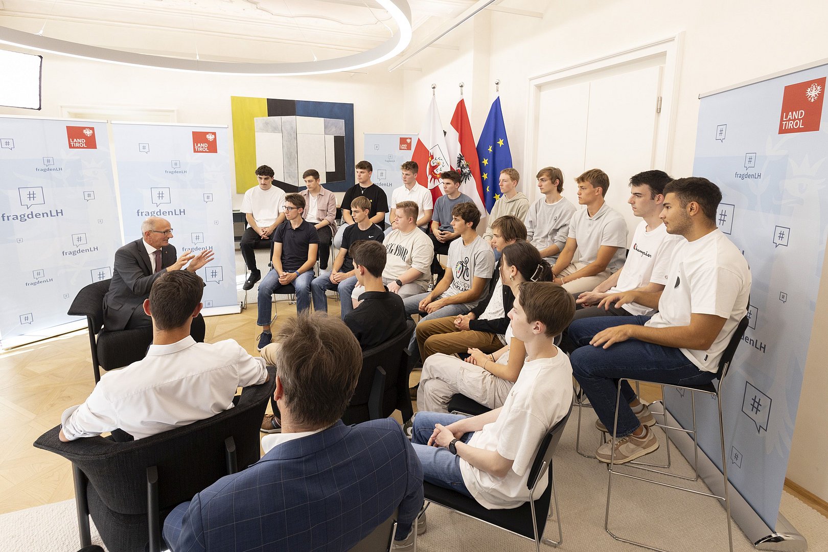 Zu Beginn des neuen Schuljahres begrüßte LH Anton Mattle im Rahmen von „Frag den LH“ die SchülerInnen der vierten Klasse der HTL Reutte im Landhaus in Innsbruck. Dass die HTL Reutte erst kürzlich ihre künftige Eigenständigkeit bestätigt bekommen hat, war naturgemäß auch Gegenstand der Gespräche. „Dass die HTL Reutte künftig als eigenständige Schule geführt wird, ist ein Schritt in die richtige Richtung. Der Bezirk Reutte ist durch führende Unternehmen in Wirtschaft und Industrie eine gefragte Region, die gut ausgebildeten Fachkräften viele Möglichkeiten bietet. Für die Schülerinnen und Schüler hat sich damit eine Ausbildungsschiene im Bezirk gefestigt, mit der sie auch direkt im Bezirk beste Jobaussichten haben. Umso mehr freute es mich, direkt mit den davon HTL-Schülerinnen und HTL-Schülern zu diskutieren“, so LH Mattle.