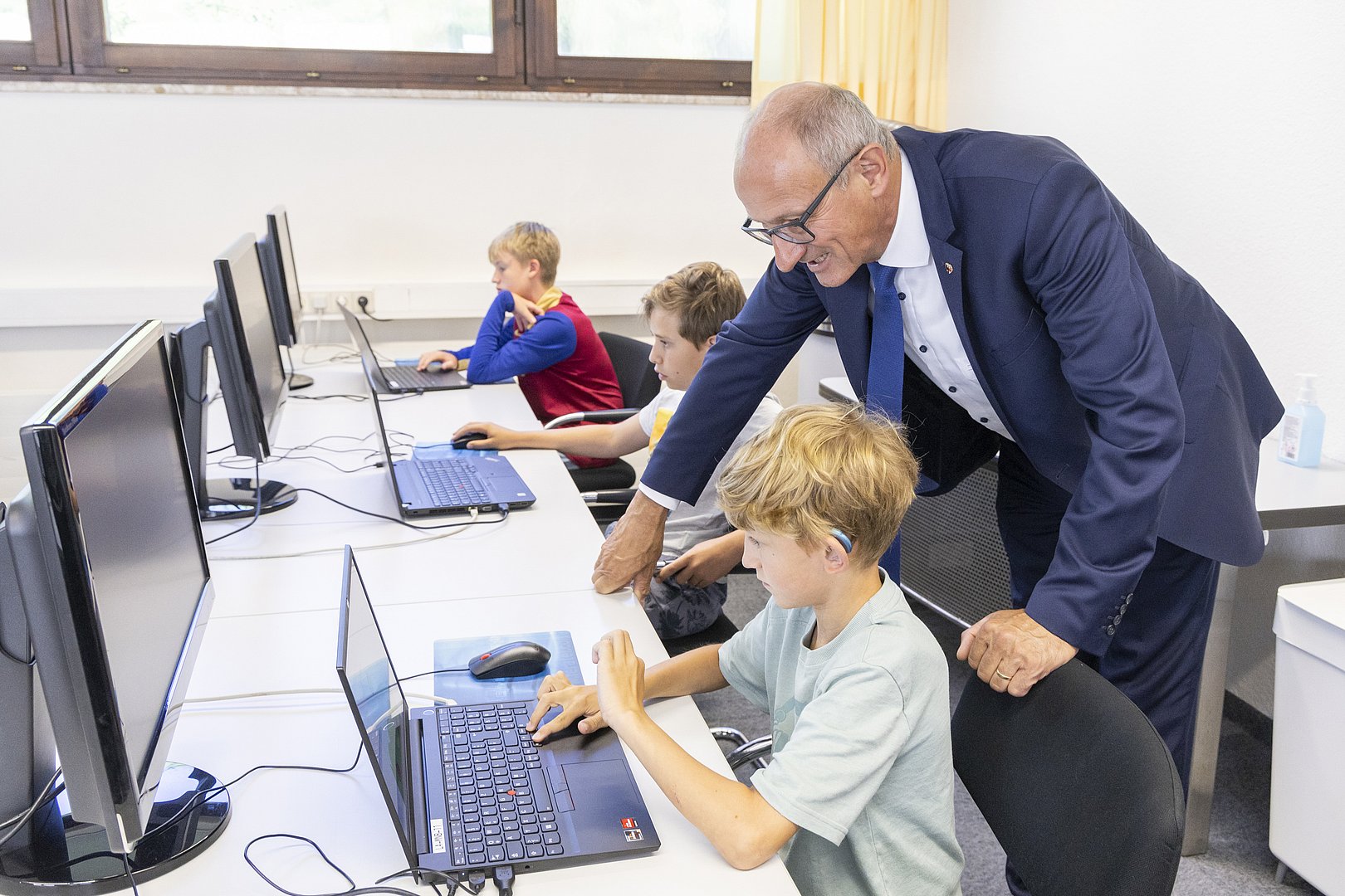 Stellvertretend für die gesamte Gruppe wurden die Fragen von Felix Spöttl, Aaron Mark und Jonathan Juen gestellt. Die Kinder wollten zunächst von LH Mattle wissen, ob es in Zukunft mehr Berufe im Bereich Programmierung in Tirol geben wird. „Die MINT-Berufe spielen in Tirol aktuell eine ganz große Rolle. Die Ausbildung hierfür beginnt im Kindergarten, geht über Volksschulen und Gymnasien bis hin zu weiterbildenden Schulen. Ich bin davon überzeugt, dass gerade Berufsbilder mit technischen und kaufmännischen Segmenten, in denen Programmierung wesentlich ist, in Zukunft noch gefragter sein und mehr werden“, erklärte LH Mattle.