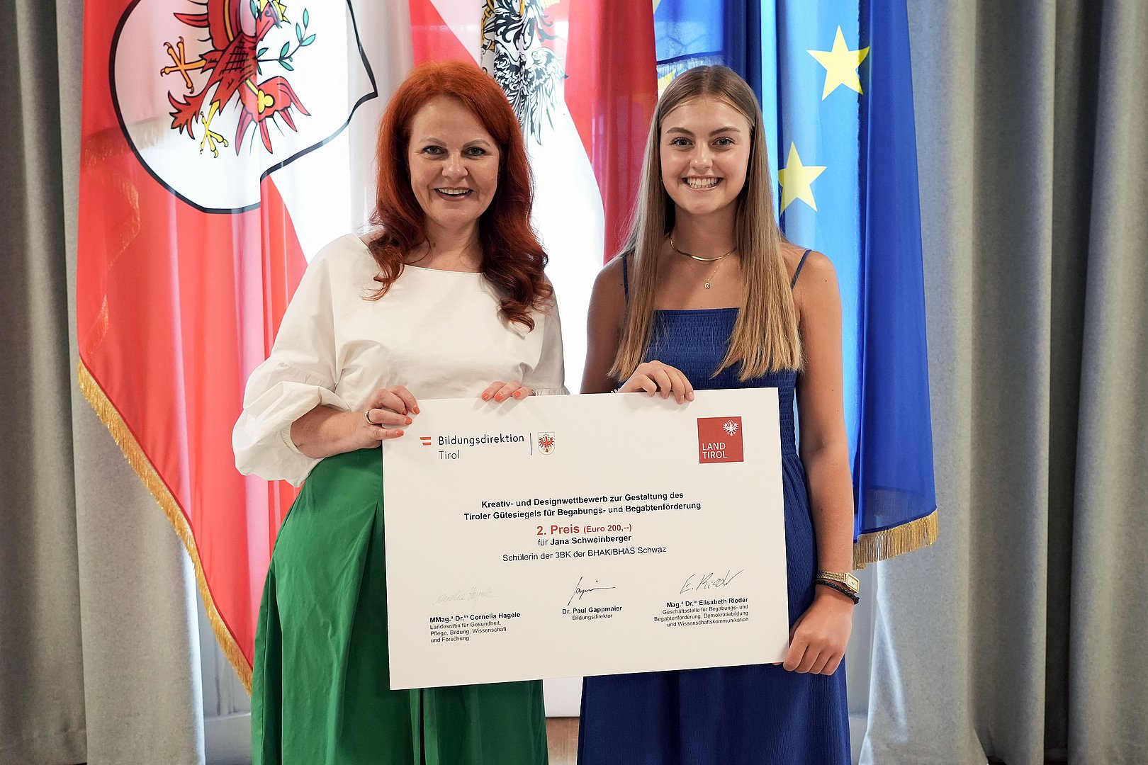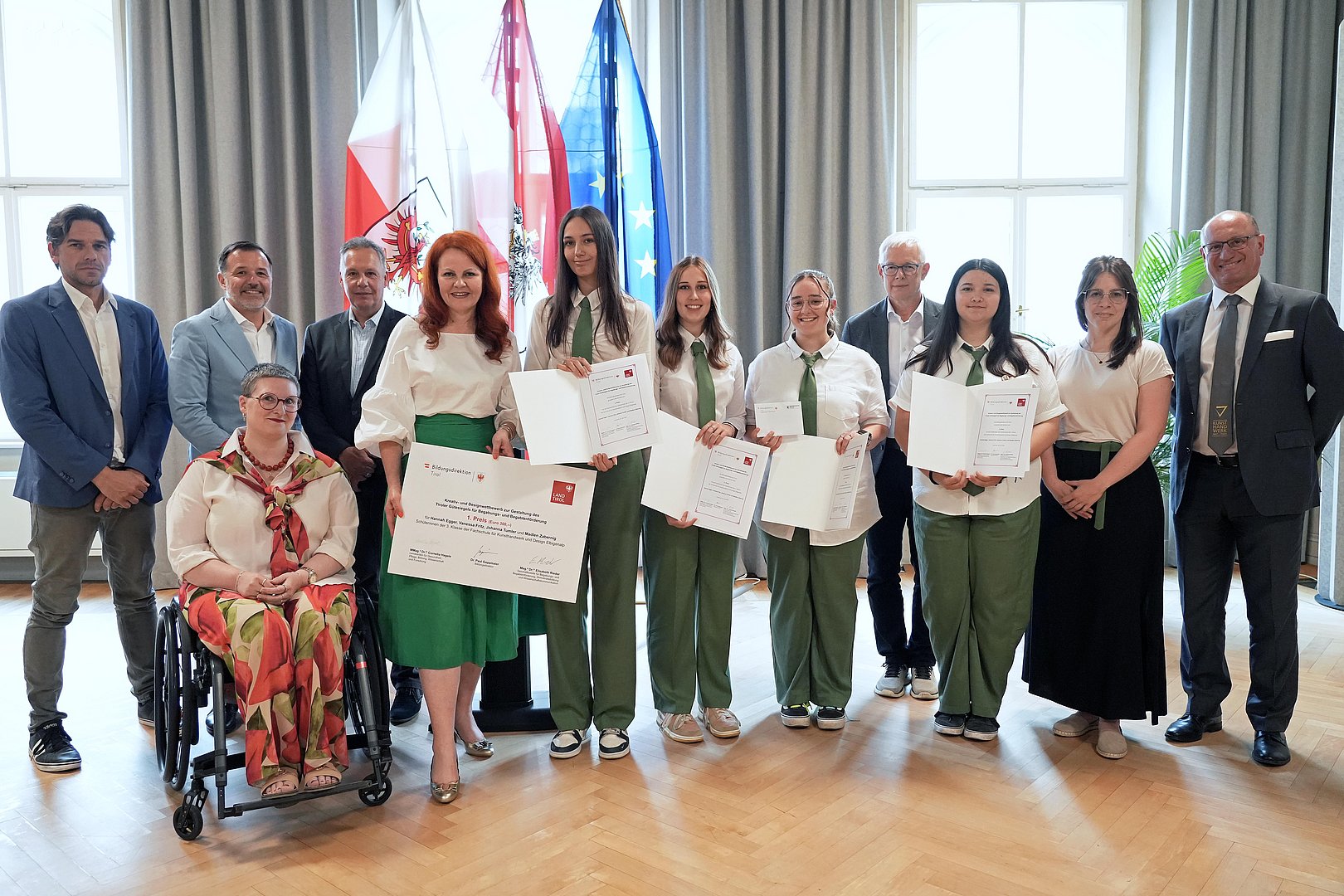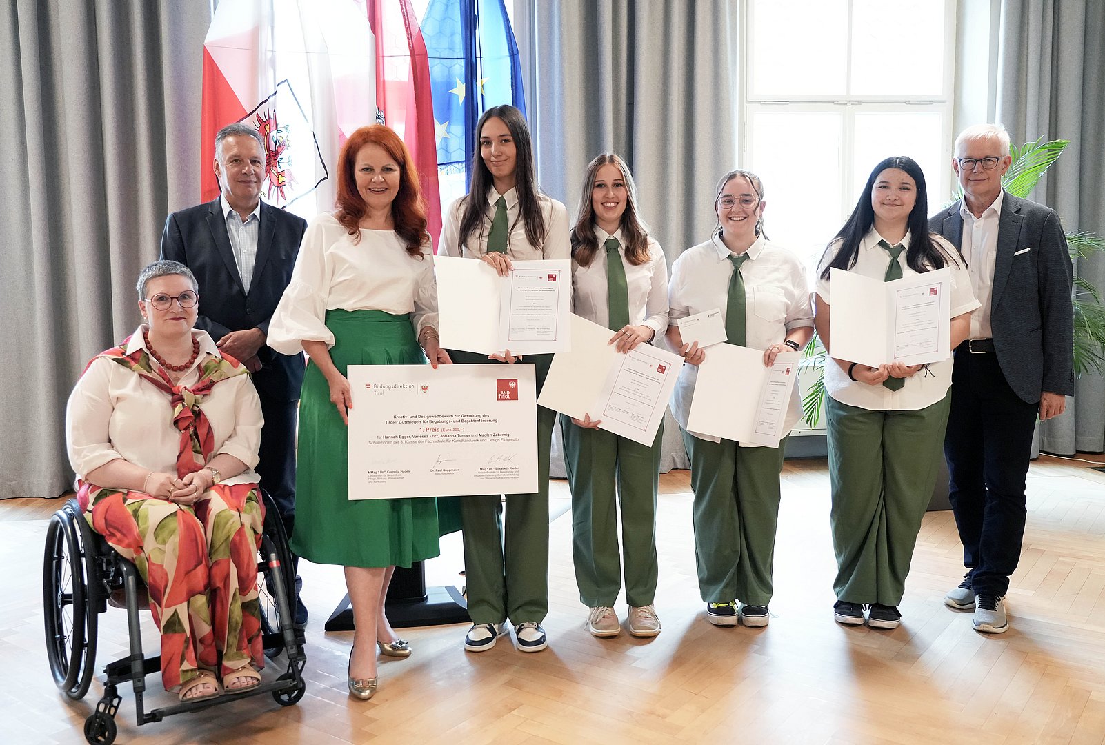 Mit klarer Bildsprache und ansprechendem Design: Bildungslandesrätin Cornelia Hagele überreichte gemeinsam mit Bildungsdirektor Paul Gappmaier den Hauptpreis für den Kreativwettbewerb zur Gestaltung eines neuen Tiroler Gütesiegels für Begabungs- und Begabtenförderung an die Fachschule für Kunsthandwerk und Design Elbigenalp (Bezirk Reutte). Mit ihrem ausdrucksstarken Entwurf überzeugten die Schülerinnen Hannah Egger aus Reutte, Vanessa Fritz aus Lechleiten/Steeg, Johanna Tumler aus Wengle/Bichlbach und Madlen Zabernig aus Lermoos die hochkarätig besetzte Jury. Die feierliche Preisverleihung fand kürzlich im Parissaal des Landhauses statt. Das neue Gütesiegel wird mit dem Schuljahr 2025/26 erstmals ausgeschrieben und unterstreicht den Anspruch auf Chancengerechtigkeit und bestmögliche individuelle Entwicklung.