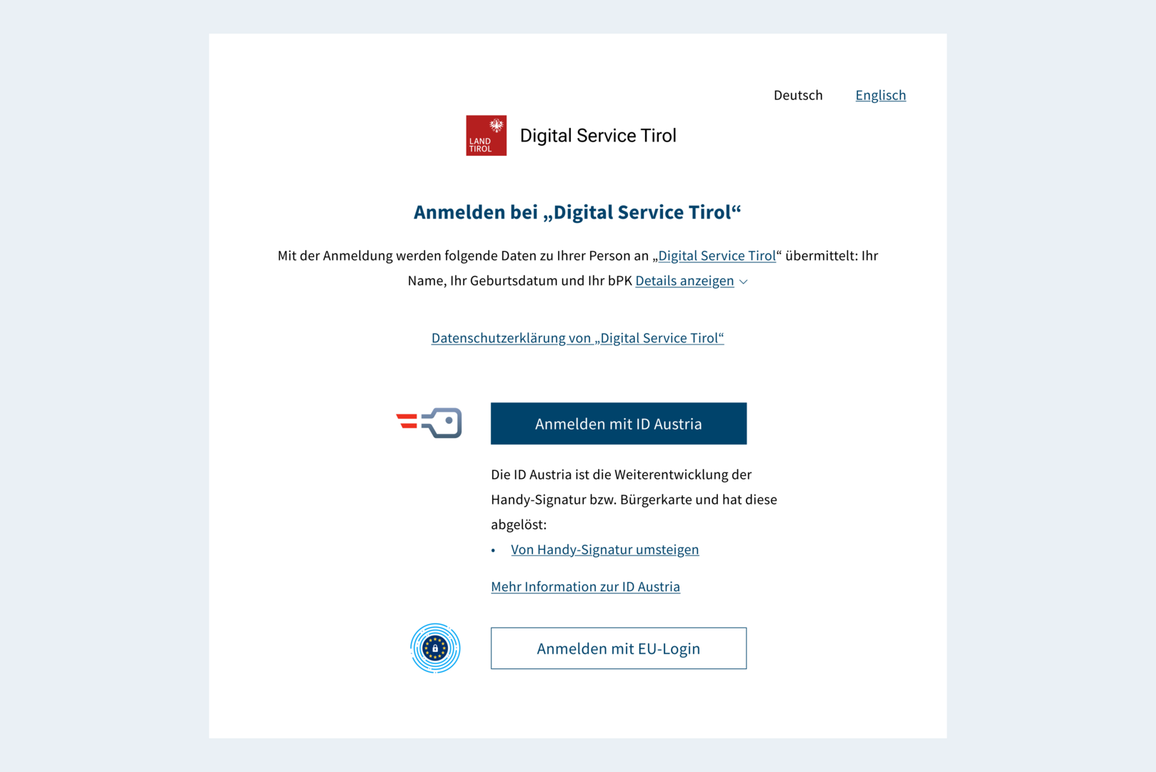 Um ein dem Stand der Technik angemessenes Datensicherheitsniveau gewährleisten zu können, ist der Zugriff auf Digital Service Tirol ausschließlich unter Verwendung einer Zwei-Faktor-Authentifizierung mittels ID Austria oder über das Unternehmensserviceportal (USP) möglich.