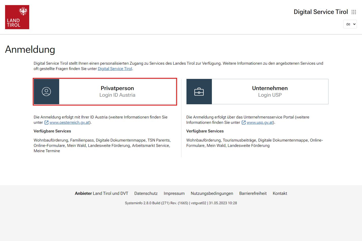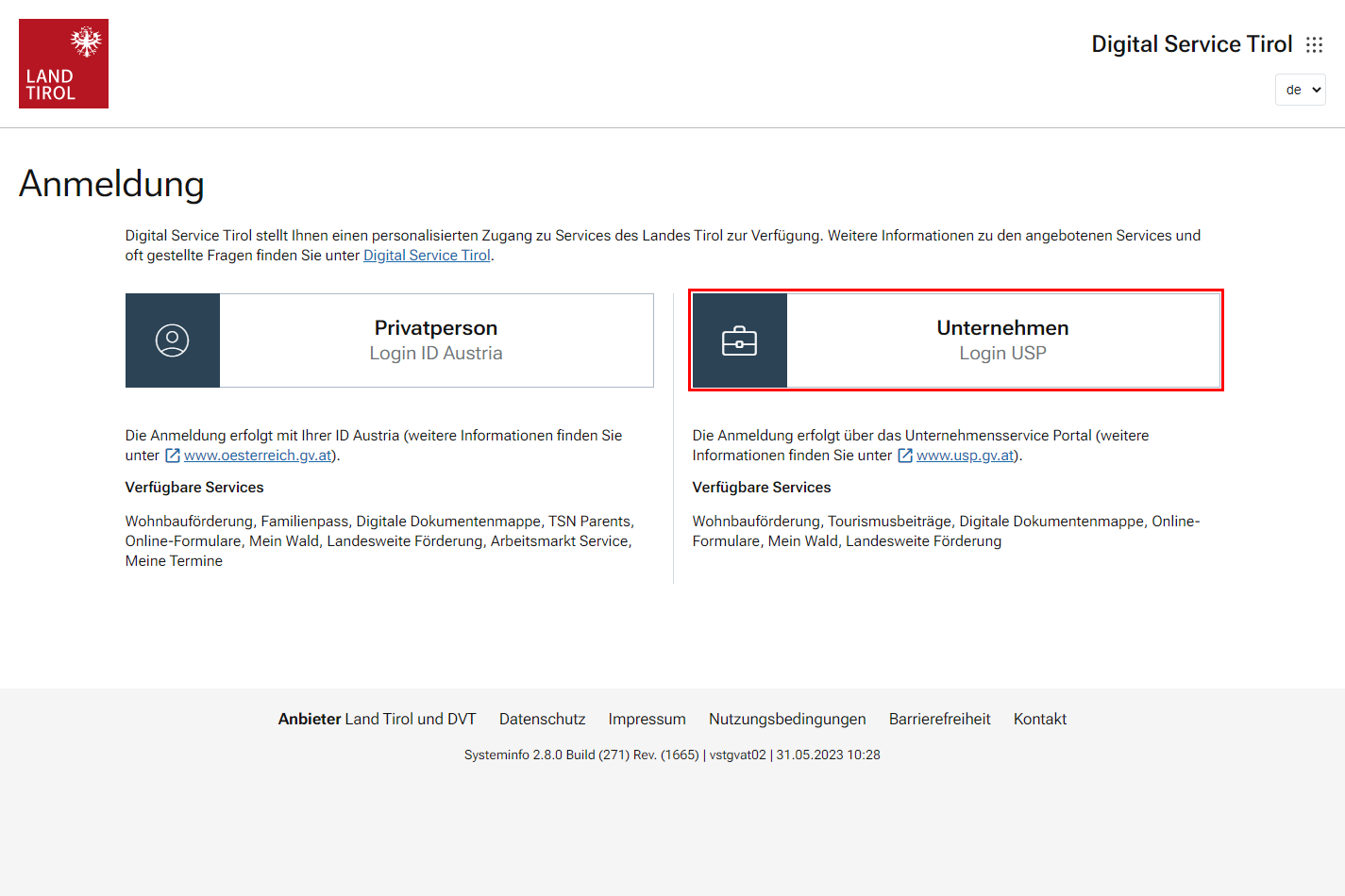 Das Land Tirol bietet über Digital Service Tirol Privatpersonen sowie Unternehmen die Möglichkeit, ausgewählte Amtswege auf sicherem Weg elektronisch zu erledigen. Darüber hinaus ist auch ein Zugriff als bevollmächtigte VertreterIn (Rechtsanwältin/Rechtsanwalt, Notarin/Notar, Steuerberaterin/Steuerberater, Bilanzbuchhalterin/Bilanzbuchhalter) möglich. Privatpersonen können sich über ID Austria, Unternehmen über das Unternehmensserviceportal (USP) anmelden.