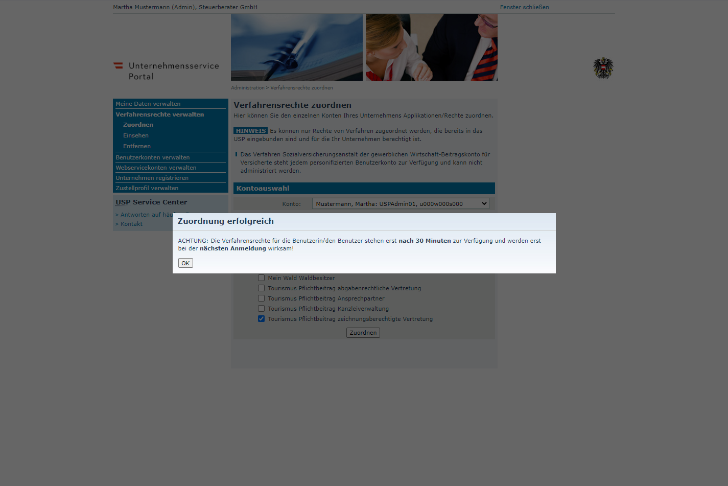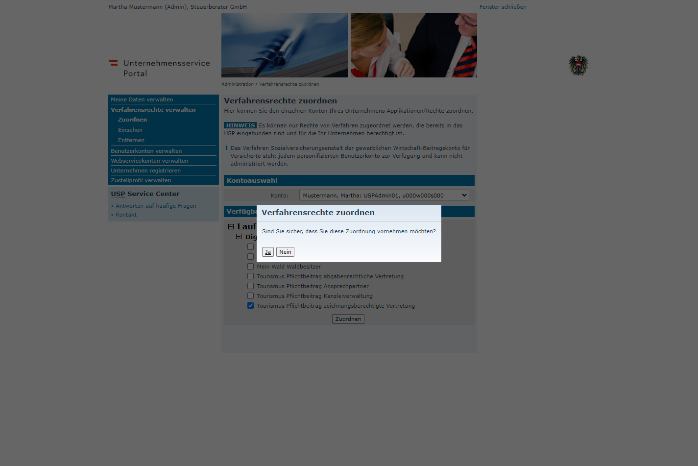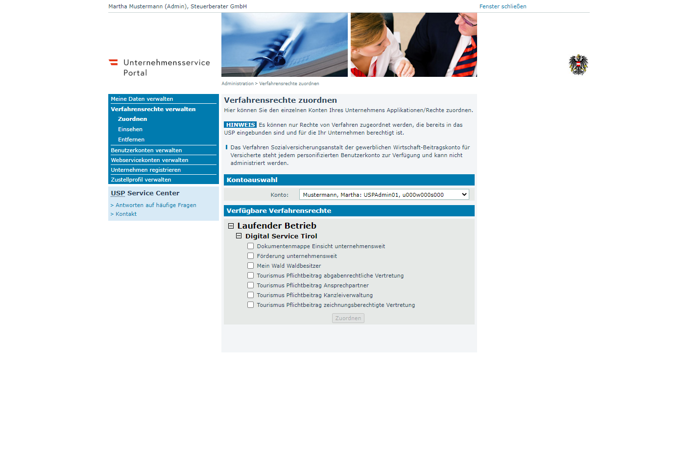 MandantInnen können für Vertretungsbefugte ein Benutzerkonto in der Administration im USP anlegen und über die Verfahrensrechte entsprechend berechtigen.