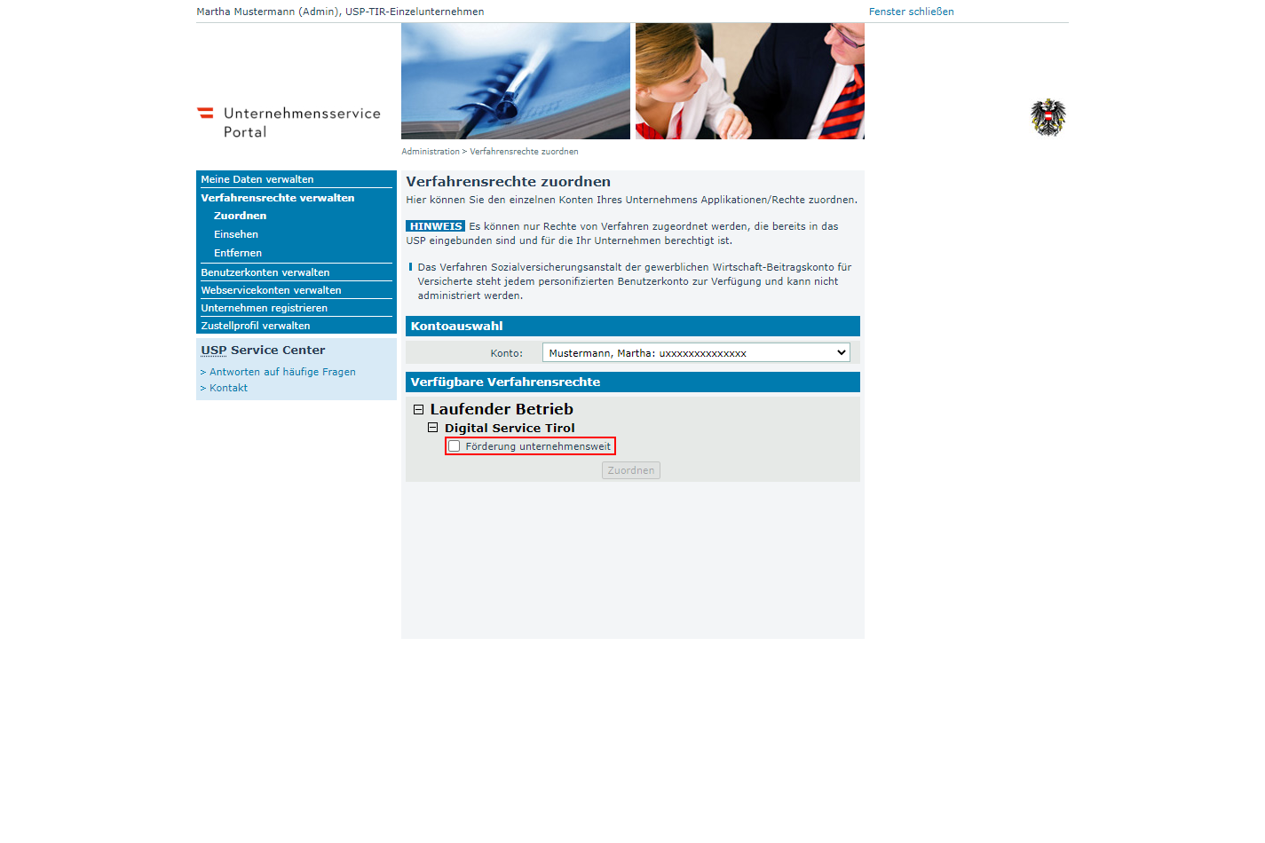 MitarbeiterInnen von Unternehmen können am Service teilnehmen, wenn sie einen personifizierten Zugang zum Unternehmensserviceportal (USP) besitzen. Es ist notwendig, dass USP-AdministratorInnen die MitarbeiterInnen im USP entsprechend berechtigen. Dies erfolgt im Bereich Administration unter „Verfahrensrechte verwalten“.