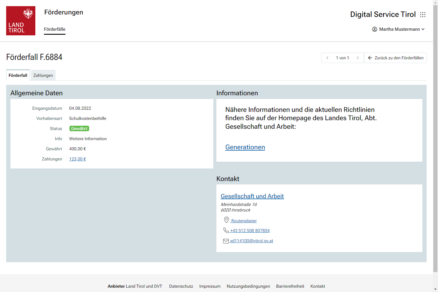 Bei Fragen zu Ihren Förderungen wenden Sie sich bitte an die zuständigen Organisationseinheit des Landes Tirol. Nutzen Sie dazu bei Förderungen, die Ihnen im Service angezeigt werden, die Kontaktinformationen aus der jeweiligen Detailansicht.