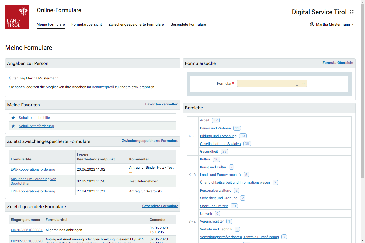 Weiters sind hier die Boxen „Meine Favoriten“, „Zuletzt zwischengespeicherte Formulare“, „Zuletzt gesendete Formulare“ und „Formularsuche“ mit den jeweiligen Formularen ersichtlich. Hier können sie über den eingefügten Link (rechts oben) in den jeweiligen Reiter abspringen. In der Box „Bereiche“ können Sie Formulare aus den jeweiligen Leistungsbereich finden.