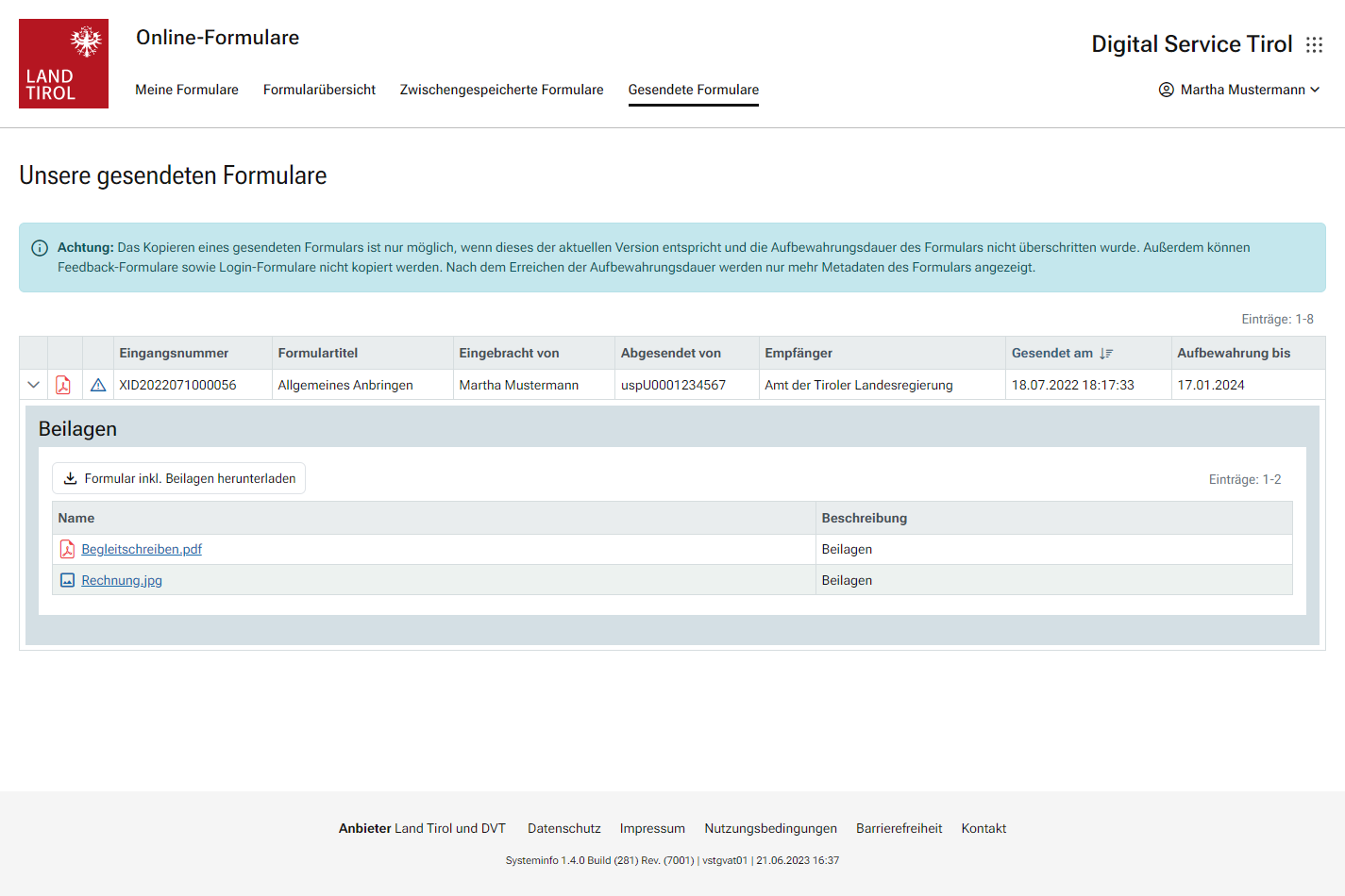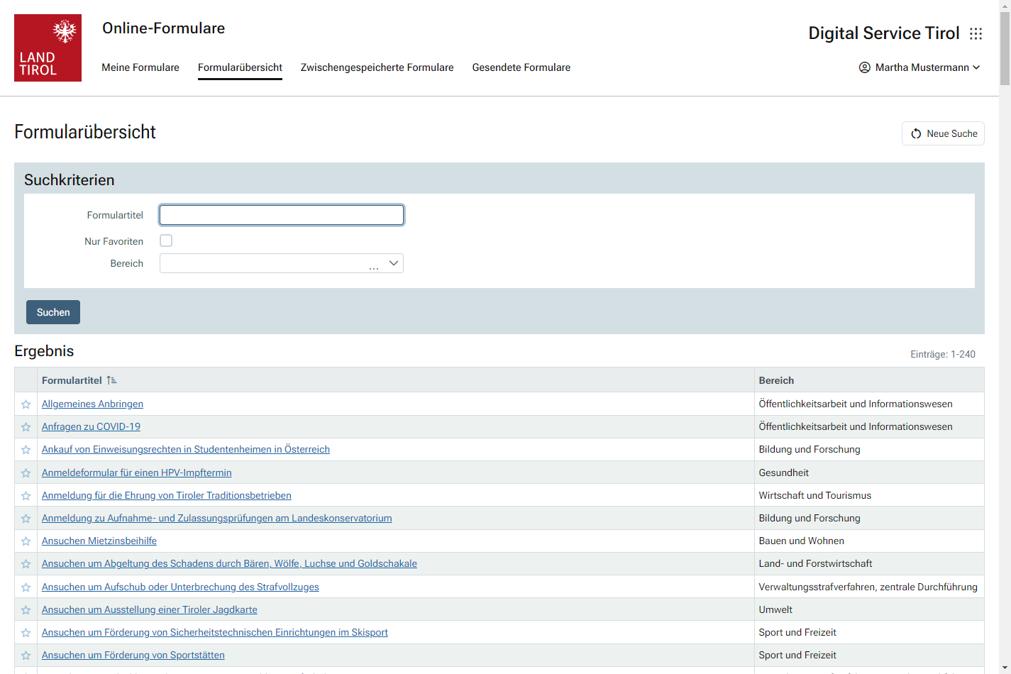 Der Service „Online-Formulare“ (im Folgenden „Service“) ermöglicht Ihnen eine sichere, vertrauliche und komfortable elektronische Kommunikation mit der Tiroler Landesverwaltung und weiteren Verwaltungseinheiten. Weiters wird Ihnen ein Überblick über Ihre sowie alle verfügbaren Online-Formulare angezeigt.