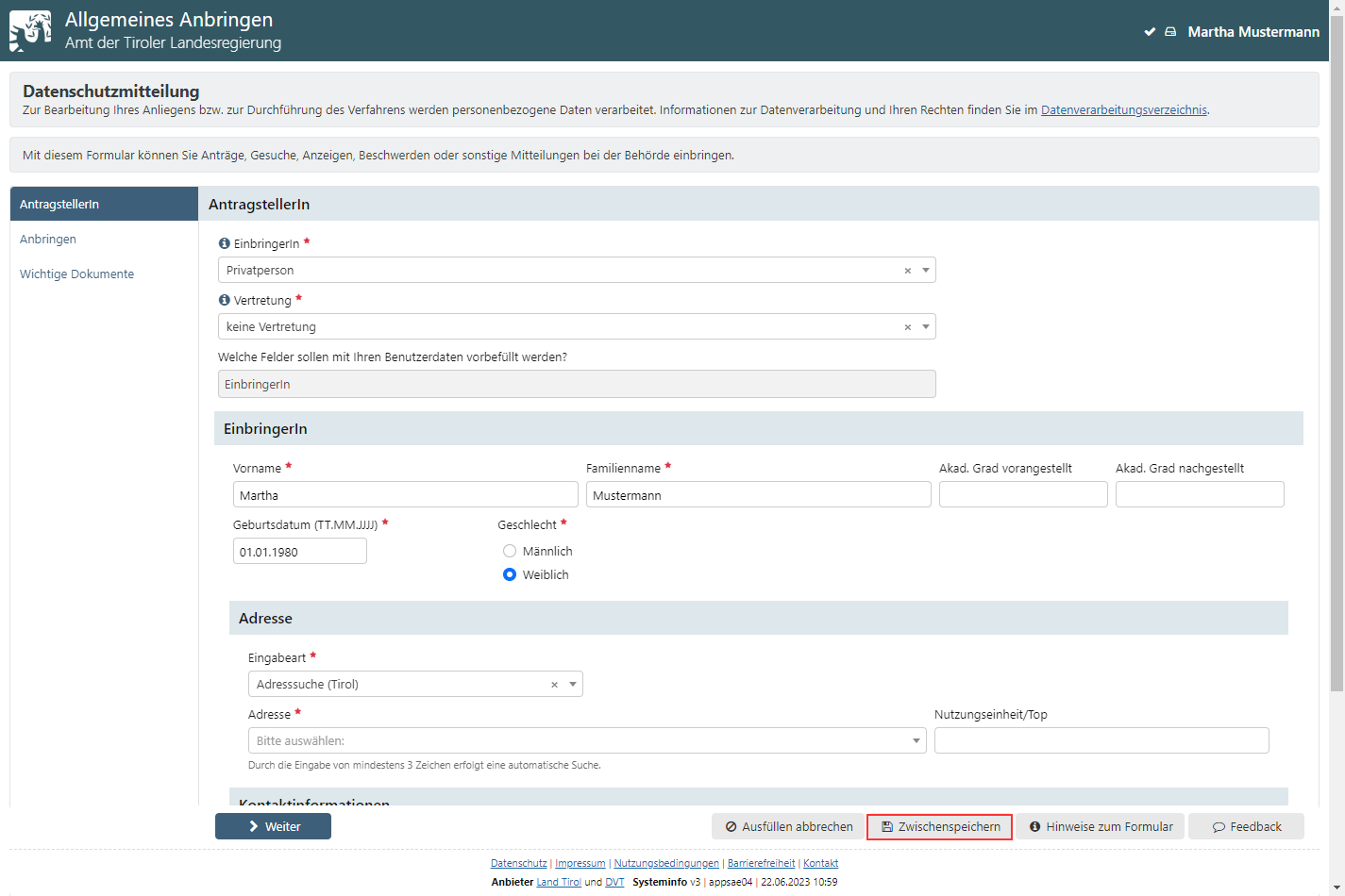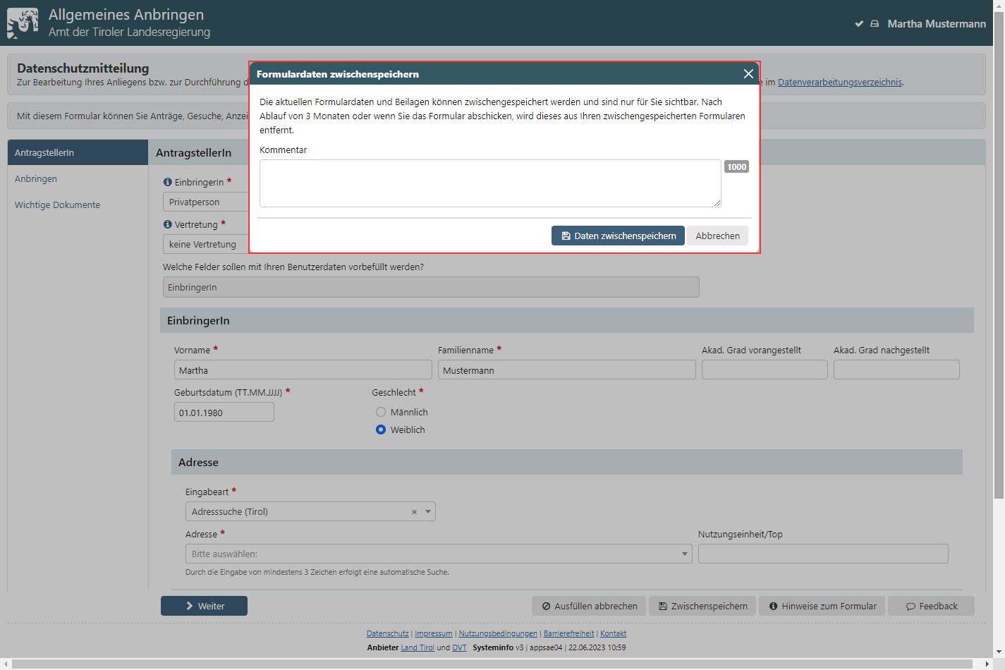 Ein teilweise ausgefülltes Formular kann mithilfe der Aktion „Zwischenspeichern“ zwischengespeichert werden und zu einem späteren Zeitpunkt weiterausgefüllt sowie abgesendet werden.