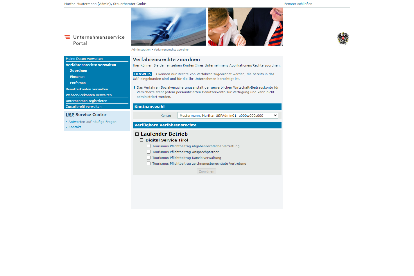 MitarbeiterInnen von Unternehmen können am Service teilnehmen, wenn sie einen personifizierten Zugang zum Unternehmensserviceportal (USP) besitzen. Es ist notwendig, dass USP-AdministratorInnen die MitarbeiterInnen im USP entsprechend berechtigen. Dies erfolgt im Bereich Administration unter „Verfahrensrechte verwalten“.