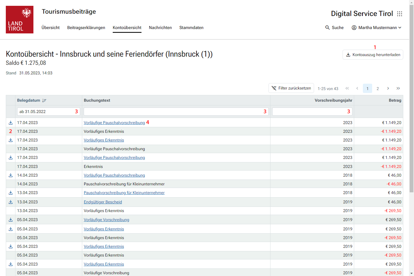 Außerdem kann ein aktueller Kontoauszug heruntergeladen werden. Der Kontoauszug ist amtssigniert.