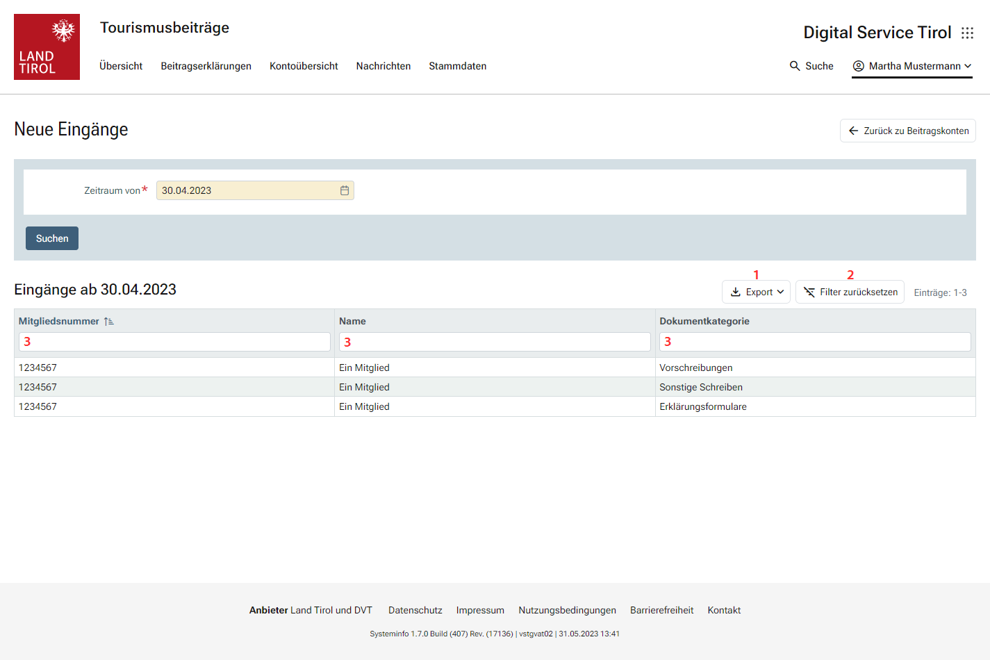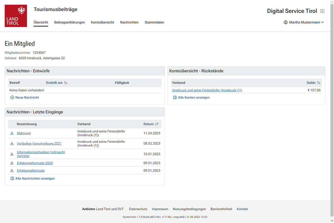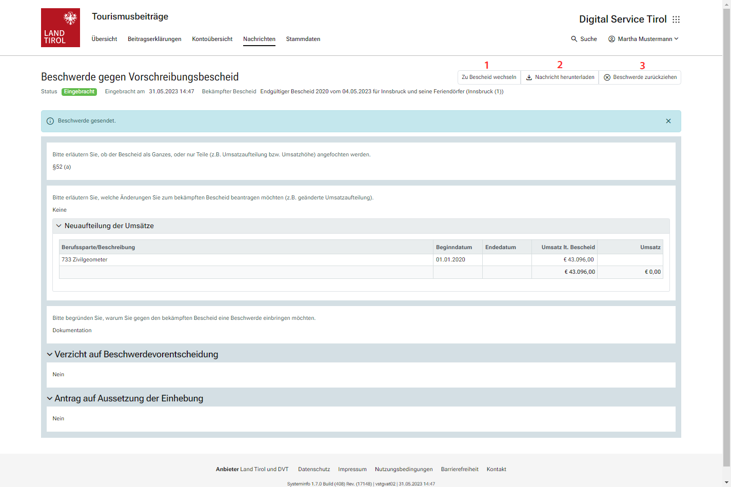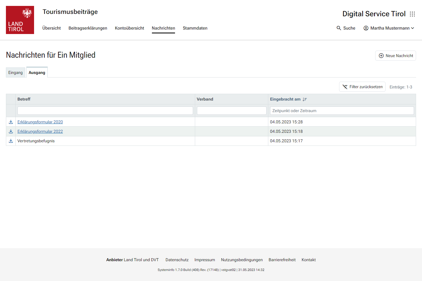 Im Bereich „Nachrichten“ wird der Schriftverkehr der Behörde mit dem Mitglied bzw. dessen abgabenrechtlicher Vertretung dargestellt. Aus technischen Gründen ist die Darstellung des Schriftverkehrs erst ab Juni 2017 möglich.