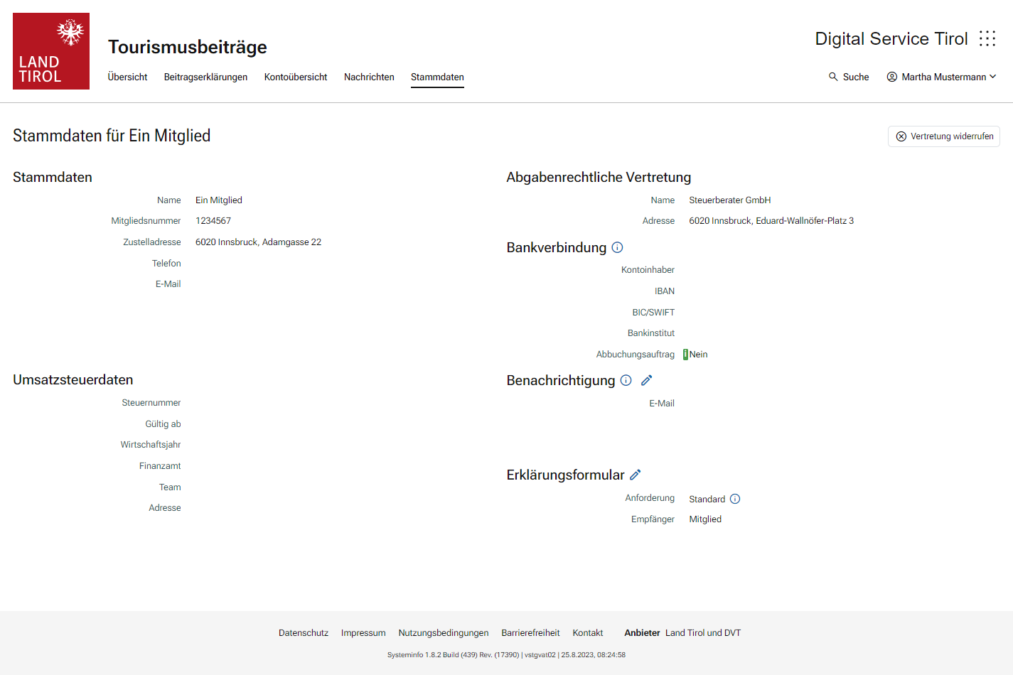 In den Stammdaten werden die wichtigsten Daten, mit denen das Mitglied erfasst ist, dargestellt. Hierzu zählen insbesondere Name und Kontaktinformationen, Angaben zur Steuernummer, die hinterlegte Bankverbindung und ob ein Lastschriftmandat besteht sowie die aktuell hinterlegte abgabenrechtliche Vertretung, welche Zugriff auf das elektronische Beitragskonto hat.