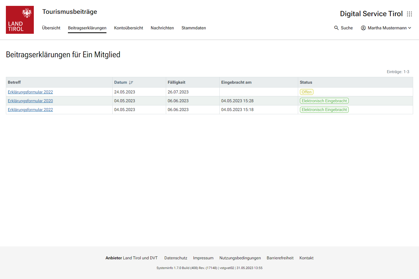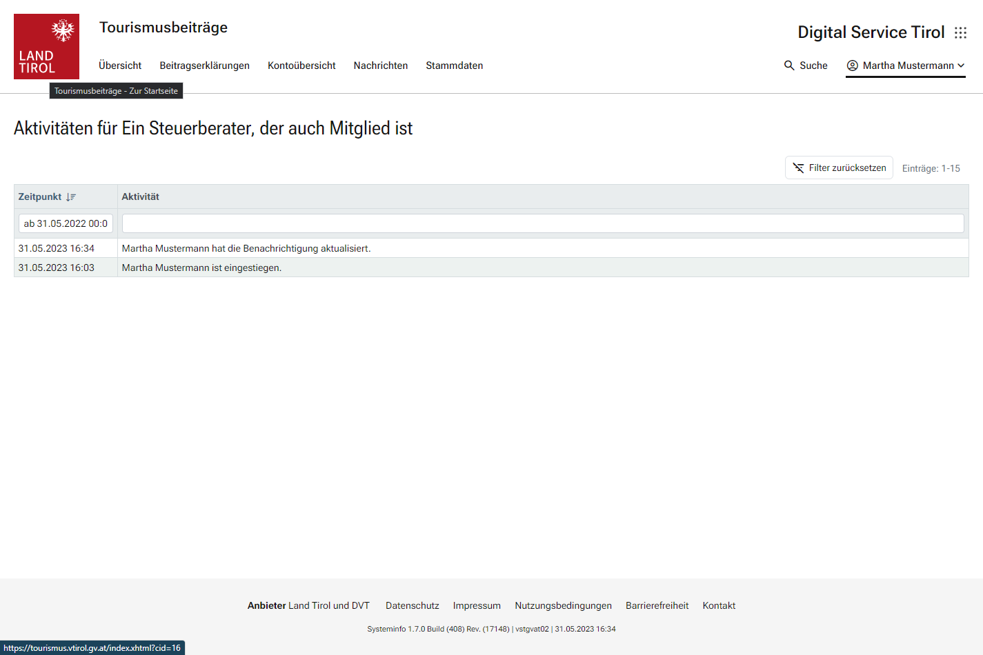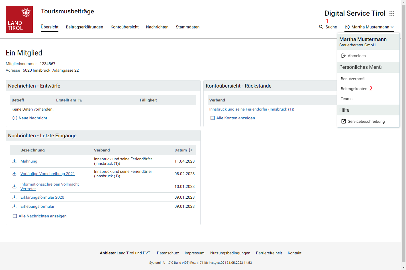 In Ausnahmefällen kann es beim Einstieg als Mitglied zur Meldung kommen, dass kein Beitragskonto zugeordnet ist. In diesen Fällen ist mit der Abteilung Tourismus des Amts der Tiroler Landesregierung Kontakt aufzunehmen, damit die Zuordnung zum Eintrag des Mitglieds im Unternehmensregister vorgenommen werden kann.