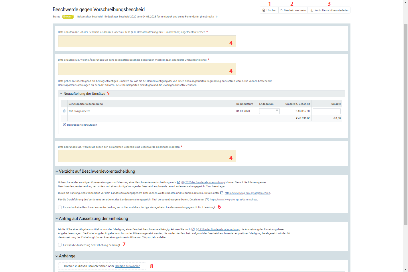 In der Beschwerdemaske sind die Pflichtangaben zur Beschwerde auszufüllen. Falls gewünscht, können die beitragspflichtigen Umsätze neu aufgeteilt, bestehende Berufssparten für beendet erklärt oder neu aufgenommene Berufssparten ergänzt werden. Zudem ist es möglich, den Verzicht auf die Erlassung einer Beschwerdevorentscheidung durch die Beitragsbehörde zu erklären sowie die Aussetzung der Einhebung des Pflichtbeitrags zu beantragen:
