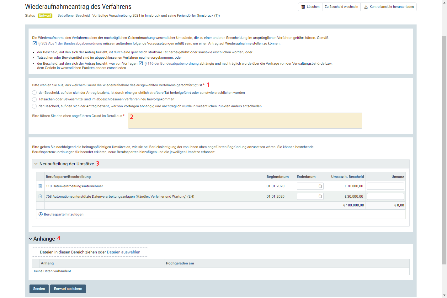 Im Wiederaufnahmeantrag ist auszuführen, weshalb dieser zulässig ist. Außerdem können die beitragspflichtigen Umsätze neu aufgeteilt, neue Berufssparten hinzugefügt und bestehende Berufssparten beendet werden. Es können mehrere Dateianhänge hinzugefügt werden.