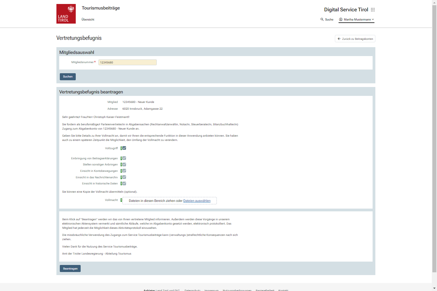 Über den Button „Neue Vertretungsbefugnis“ kann unter Angabe einer Beitragskontonummer eine neue Vollmacht eingetragen werden. Um die entsprechenden Funktionen im Service anbieten zu können, müssen bei Einrichtung einer Vollmacht einige Detailangaben zum Ausmaß der eingeräumten Vertretungsbefugnis gemacht werden. Es wird an dieser Stelle auch ein Hinweis angezeigt, wenn für das betreffende Mitglied bereits eine Vollmacht hinterlegt ist.