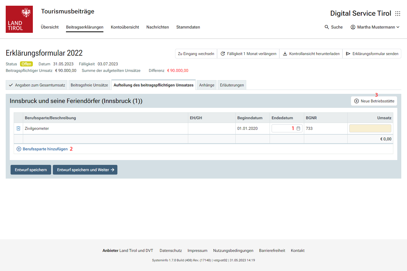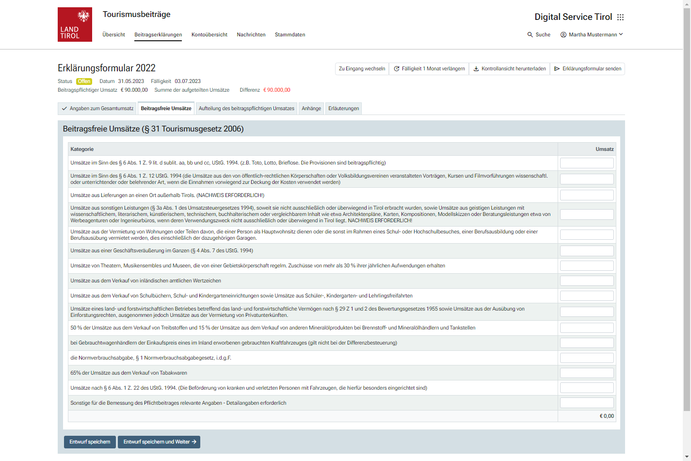 Die hier erklärten beitragspflichtigen Umsätze müssen mit den Umsätzen aus einem allfällig vorhandenen Umsatzsteuerbescheid abzüglich der erklärten beitragsfreien Umsatzbestandteile übereinstimmen. Für Berufssparten, die nach § 32 Tiroler Tourismusgesetz 2006 eine abweichende Bemessungsgrundlage anzugeben haben, wird bei Abweichungen anstelle eines Fehlers ein Warnhinweis angezeigt.
