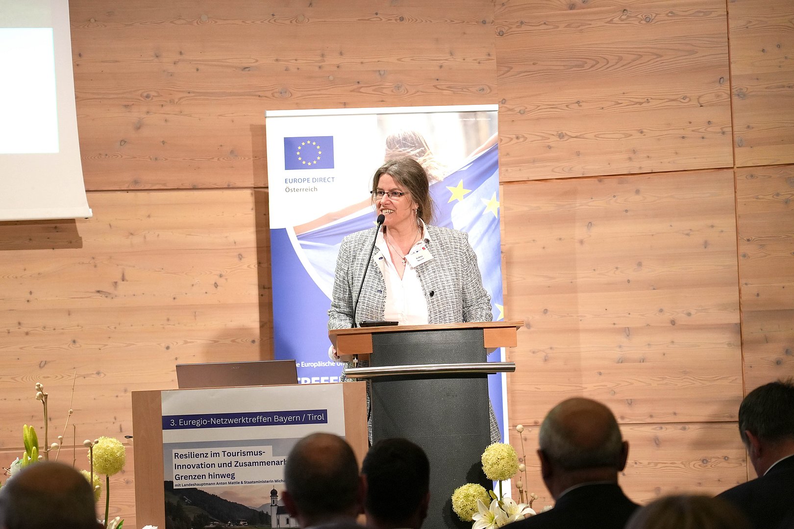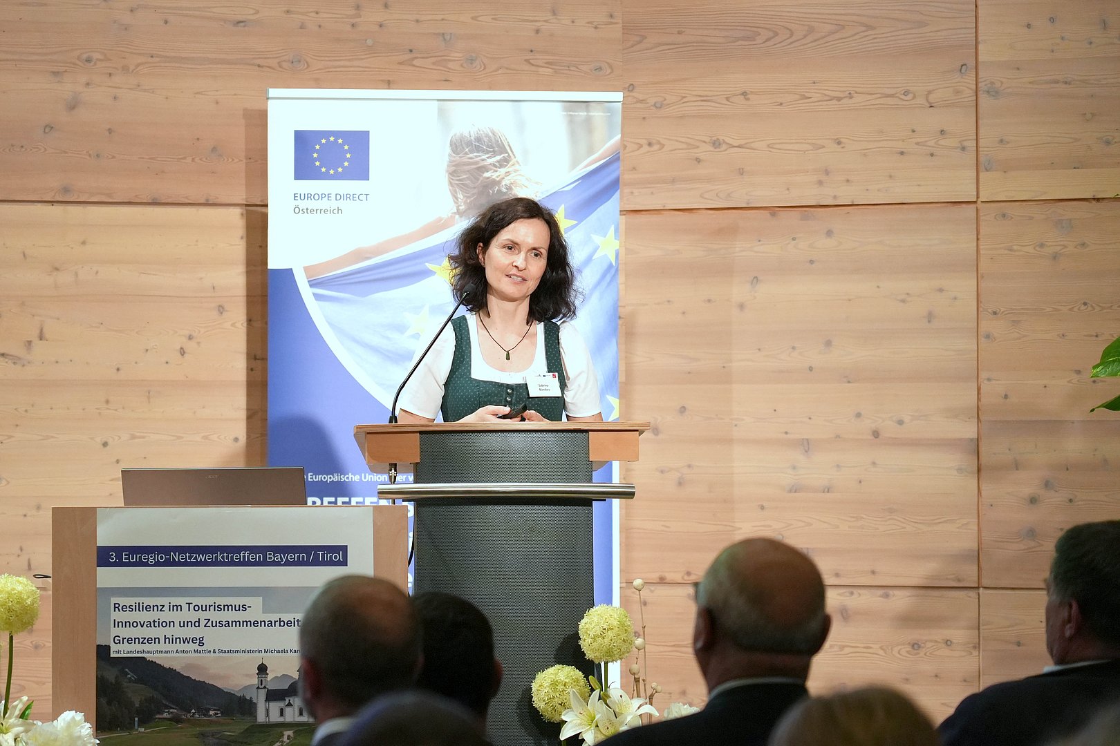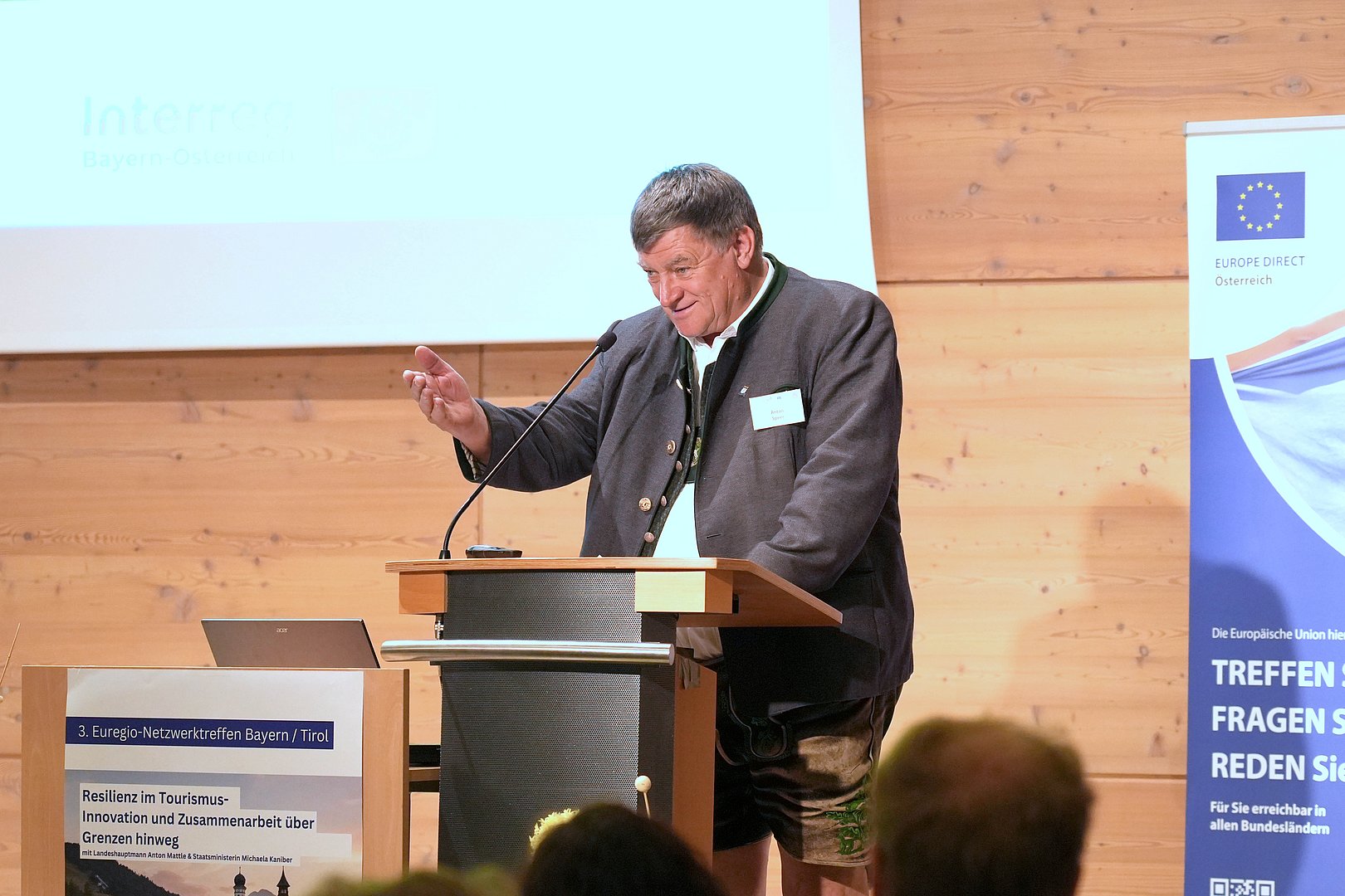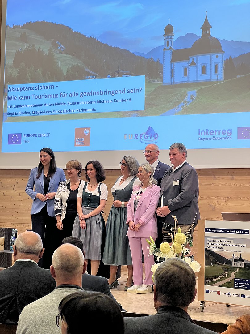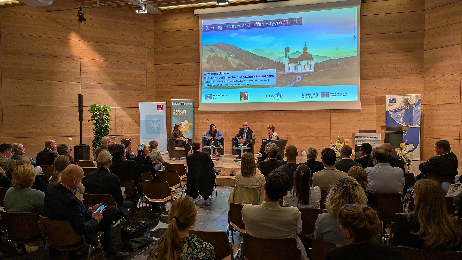 Höhepunkt des Veranstaltungsprogramms war die Podiumsdiskussion mit Landeshauptmann Anton Mattle, der Leitenden Ministerialrätin Marion Appold stellvertretend für die bayerische Staatsministerin Michaela Kaniber und der Tiroler Abgeordneten zum Europäischen Parlament Sophia Kircher, die sich der Fragestellung „Akzeptanz sichern – Wie kann Tourismus für alle gewinnbringend sein?“ widmeten.