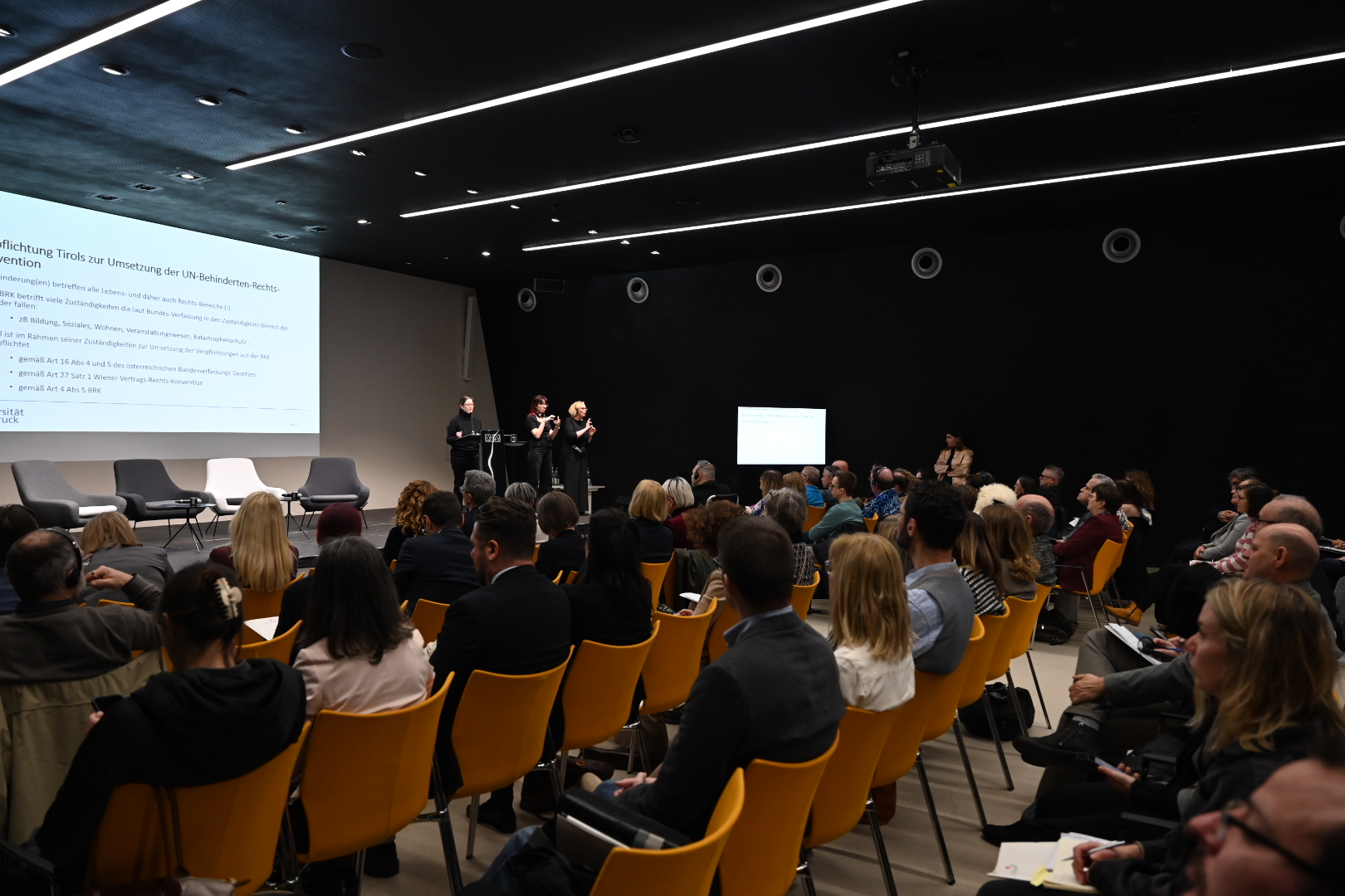 Die ReferentInnen Andreas Müller (Universität Basel), Esther Happacher und Caroline Voithofer (Universität Innsbruck) sowie Matteo Borzaga (Universität Trient und Gleichstellungsrat im Trentino), beleuchteten die UN-Behindertenrechtskonvention und ihre Umsetzung in den Ländern der Euregio aus rechtlicher Perspektive. Dabei hoben sie die engen historischen und kulturellen Beziehungen zwischen Tirol, Südtirol und dem Trentino sowie die gemeinsamen rechtlichen Verpflichtungen aus der UN-Behindertenrechtskonvention hervor, die eine abgestimmte Gestaltung im Inklusionsbereich erfordern. Als zentrale Faktoren in der Umsetzung der UN-Behindertenrechtskonvention führten sie Barrierefreiheit, Deinstitutionalisierung, Selbst- und Mitbestimmung an. Zugleich brauche es aber auch Bewusstseinsbildung und einen Paradigmenwechsel im Verständnis für Menschen mit Behinderungen.