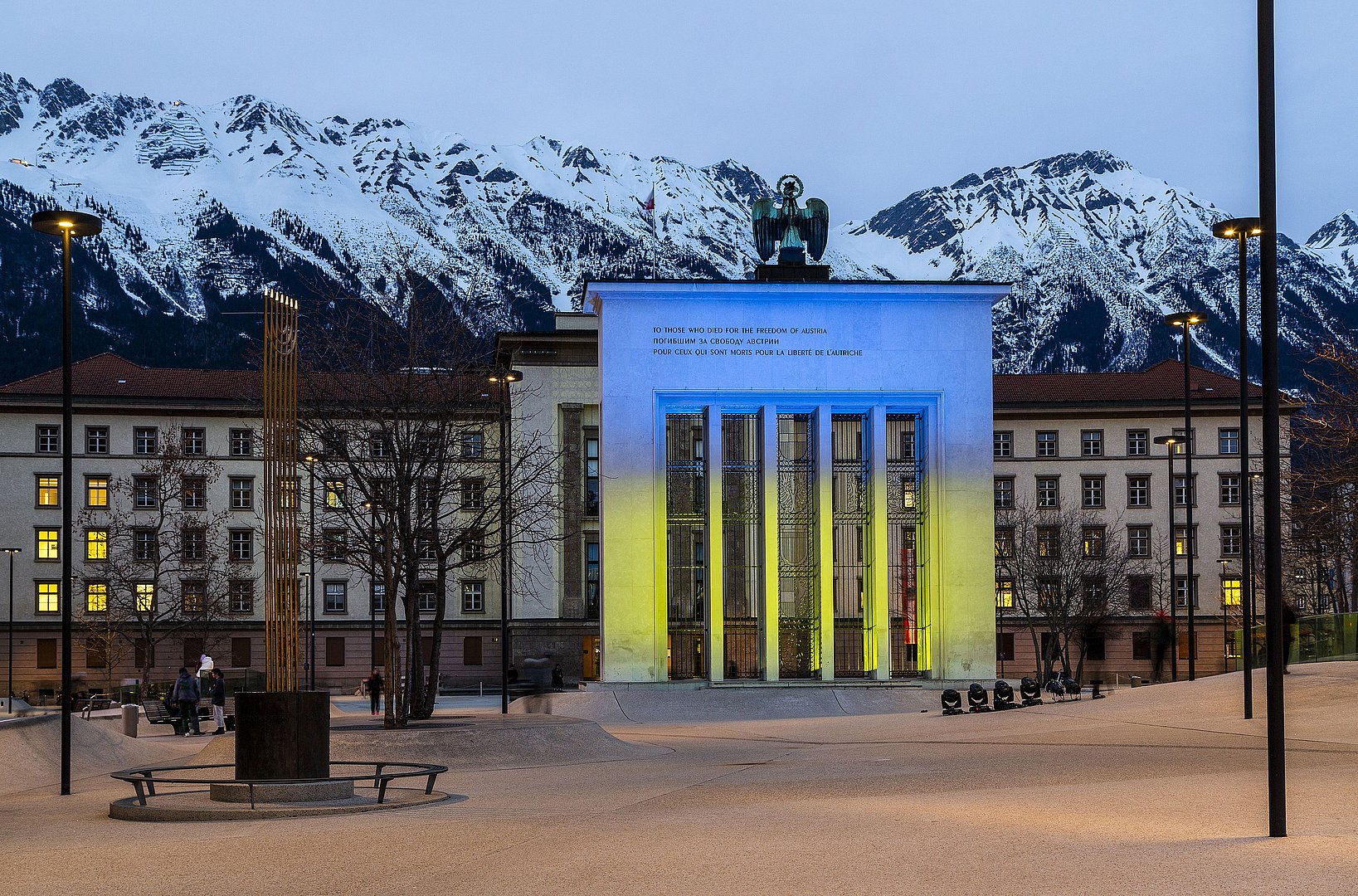 • Befreiungsdenkmal am Landhausplatz in Innsbruck wird heute Abend in den Nationalfarben der Ukraine beleuchtet