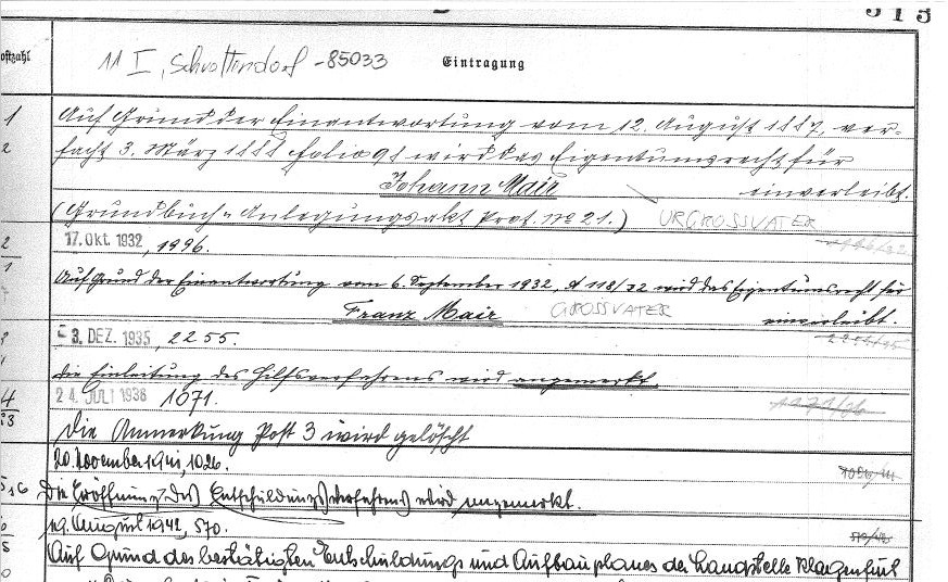 Jeder Hof hat im Grundbuch eine eigene Einlagezahl (z. B. 16/I bzw. 90016) innerhalb der jeweiligen Katastralgemeinde. Auf dem sogenannten B-Blatt des alten Hauptbuches und dem Verzeichnis der gelöschten Eintragungen finden sich namentlich sämtliche Vorbesitzer seit der Grundbuchanlegung. Es lässt sich auf einen Blick feststellen, wie viele Generationen im 20. bzw. 21. Jahrhundert am Hof saßen und wann etwa der Vater/die Mutter, der Großvater/die Großmutter, der Urgroßvater/die Urgroßmutter den Hof erbte, übernahm oder kaufte. Für die Antragsbegutachtung ist es wichtig, wann und wie die Vorbesitzer den Hof erwarben (Besitztitel). Ebenso wichtig ist aber, in welchem Verwandtschaftsverhältnis die Vorbesitzer zueinander standen.