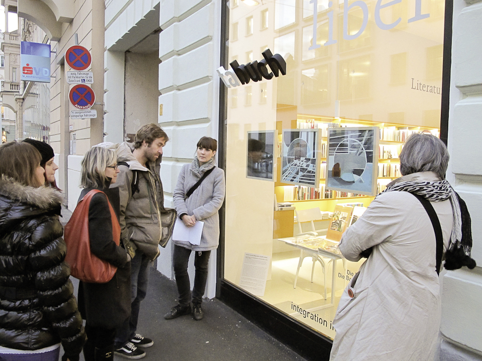 Die Exponate traten in Beziehung mit dem Geschäft, den Waren und dem/der PassantIn. Sie ragten in den Stadtraum hinein und fanden ihre Fortsetzung im Innenraum. Die Arbeiten der KünstlerInnen befassten sich mit Identität und Zugehörigkeit, thematisierten gesellschaftliche Normierungen und verhandelten Mobilität und Veränderung.