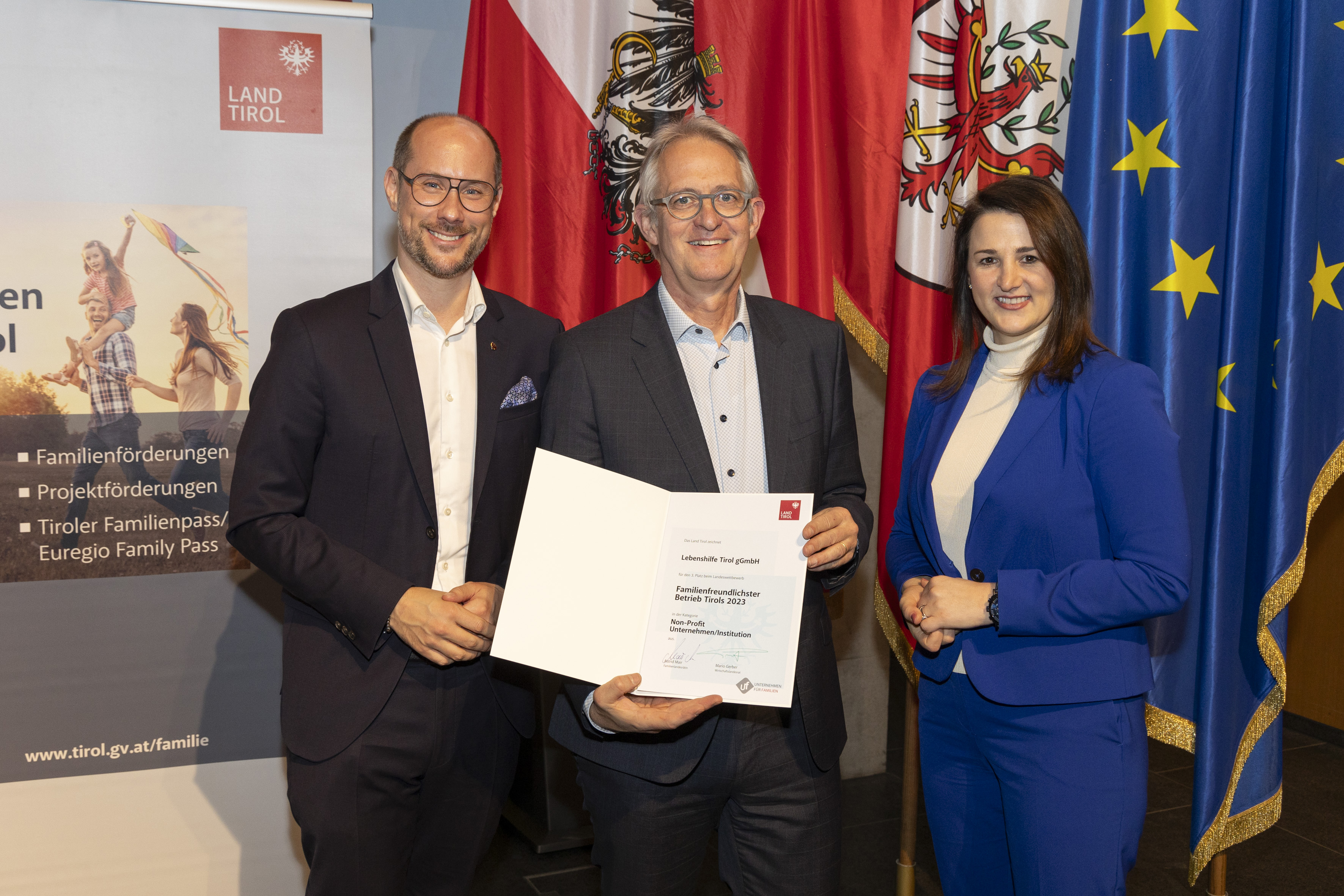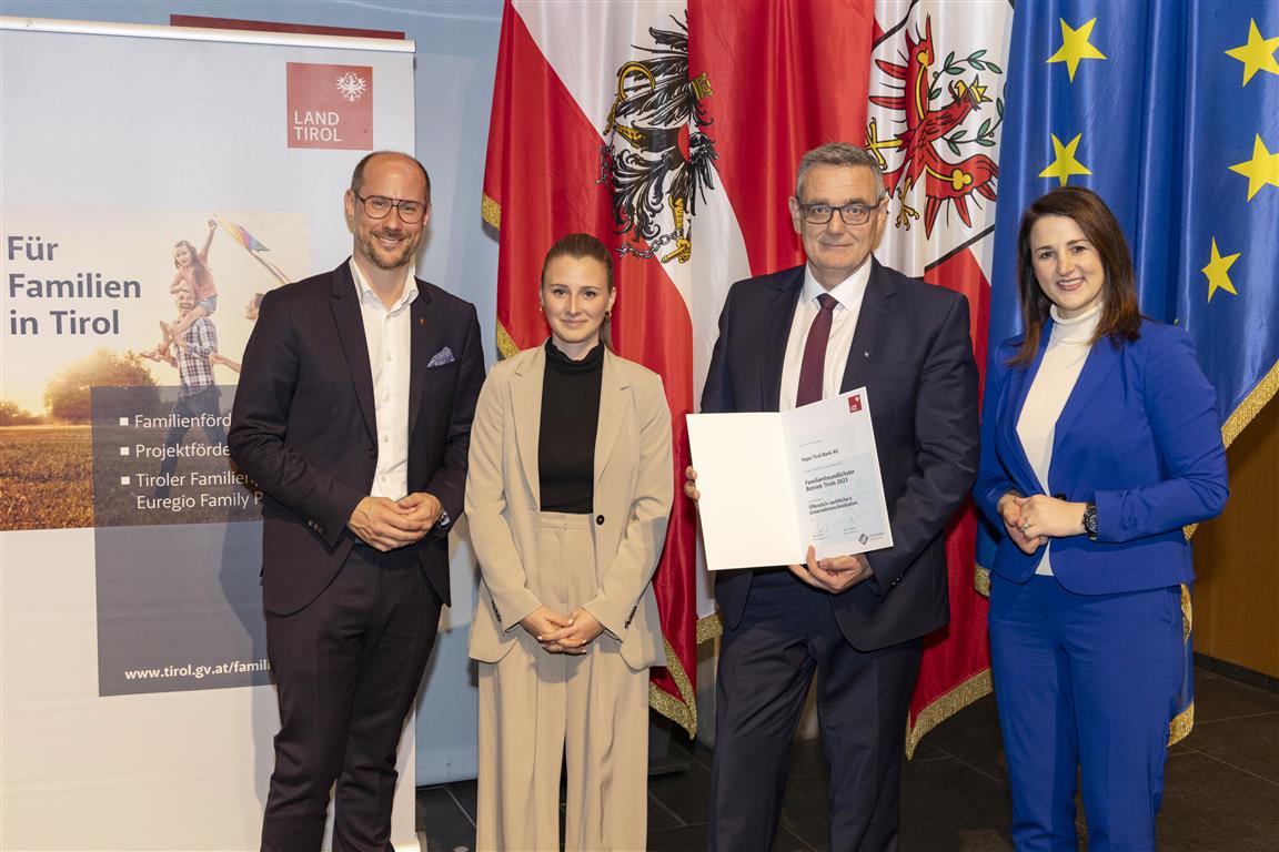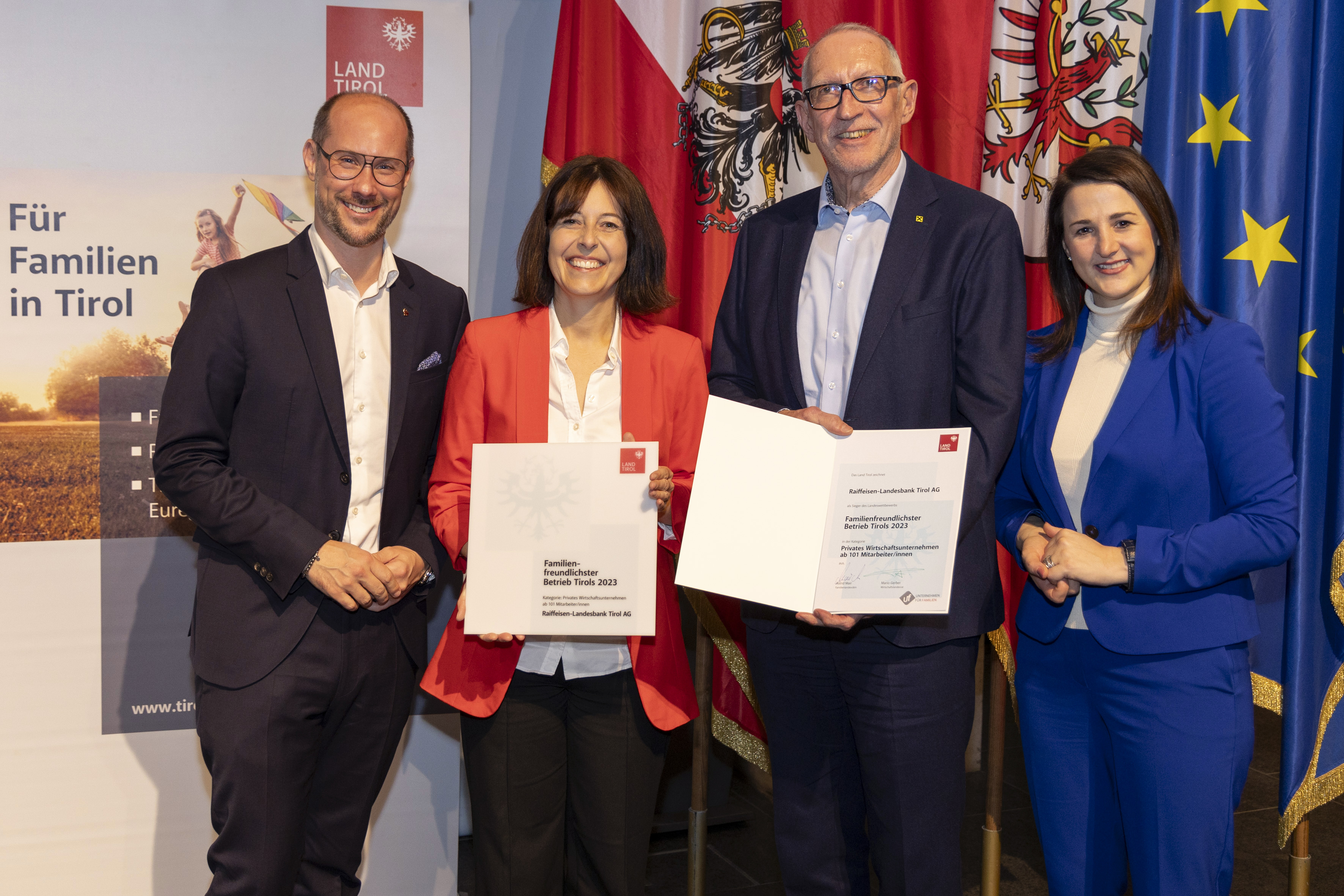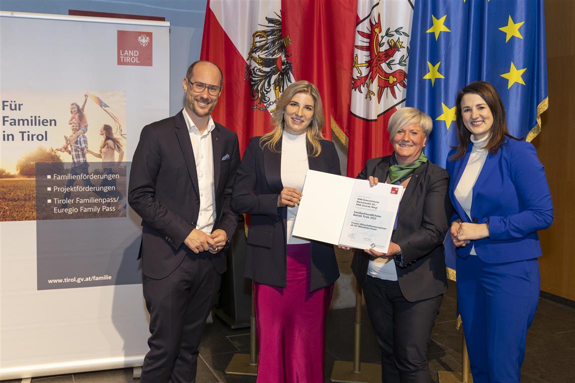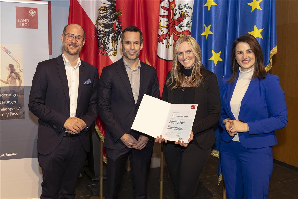 Anlässlich der feierlichen Urkundenübergabe am 27. Februar 2024 konnten Familienlandesrätin Astrid Mair und Wirtschaftslandesrat Mario Gerber 72 Unternehmen/Institutionen für die erfolgreiche Teilnahme am Landeswettbewerb Familienfreundlichster Betrieb Tirols 2023 auszeichnen.