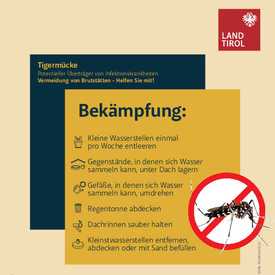 Um die Verbreitung der Asiatischen Tigermücke in Tirol einzudämmen, wurde daher erst kürzlich allen Tiroler Gemeinden seitens des Landes Informationsmaterial zur Verfügung gestellt. In bewohnten Gebieten bieten beispielsweise Parks und Gärten viele potenzielle Brutstatten und erleichtern so die Ansiedlung der Tigermücken. „Städtische ‚Wärmeinsel-Effekte‘ und künstliche Bewässerung erhöhen das Überleben und den Bruterfolg der Tigermücke. Daher ist es wichtig, die Menschen zu sensibilisieren, um Brutstätten zu vermeiden und damit die Verbreitung der Tigermücke in Tirol einzudämmen“, betont Gesundheitsdirektorin Geley.
