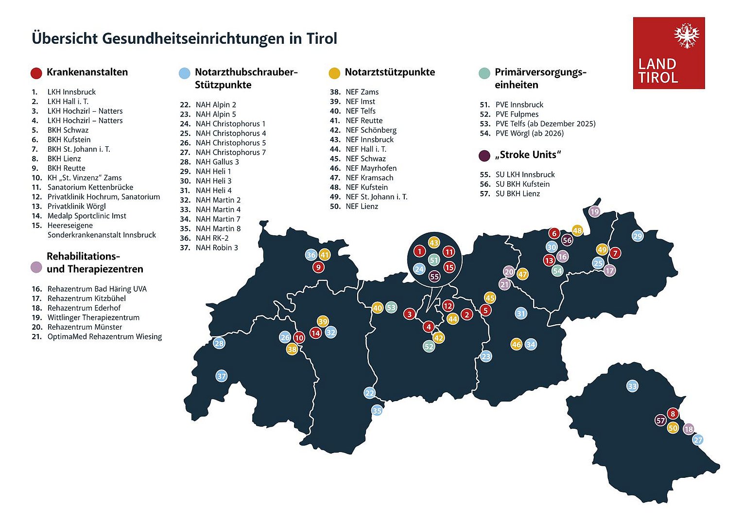 Die Gesundheitsversorgung ist in allen Regionen bereits sehr breit aufgestellt: Neun Landes- und Bezirkskrankenhäuser sowie vier private bettenführende Krankenanstalten in Innsbruck, Hochrum, Wörgl und Imst und die heereseigene Sonderkrankenanstalt sichern die stationäre Grund- und Akutversorgung. Für die Nachversorgung und Langzeitpflege stehen ergänzend fünf Rehabilitationszentren, ein Therapiezentrum, 93 Alten- und Pflegeheime (darunter die Landespflegeklinik Hall) und 66 mobile Dienste bereit. Im niedergelassenen Bereich sorgen aktuell zwei Primärversorgungseinheiten in Innsbruck und Fulpmes, sechs ÖGK-eigene Ambulatorien sowie rund 1.900 niedergelassene ÄrztInnen mit und ohne Kassenvertrag für eine wohnortnahe Betreuung.