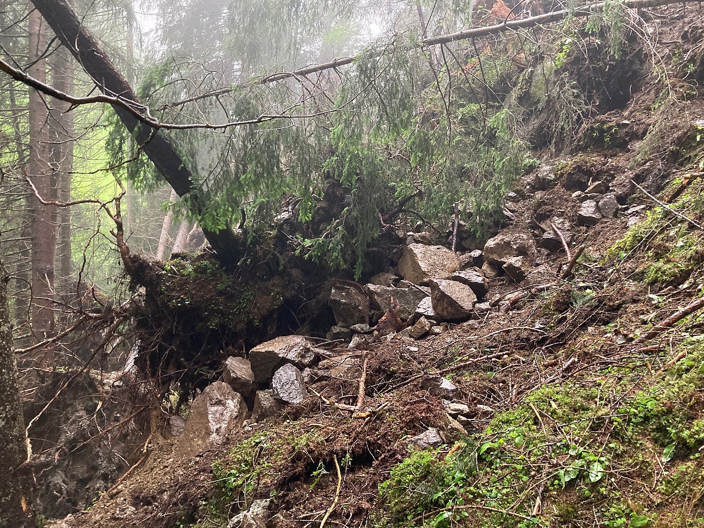 „Es handelt sich um einen größeren Hangrutsch mit einigen absturzgefährdeten Blöcken. Dies steht in Zusammenhang mit dem Windwurfereignis von letzter Woche. Nachdem die Fels- und Baumräumung abgeschlossen ist, werden weitere Hangsicherungsmaßnahmen durchgeführt“, so die Landesgeologin Petra Nittel-Gärtner im Anschluss an den Lokalaugenschein.