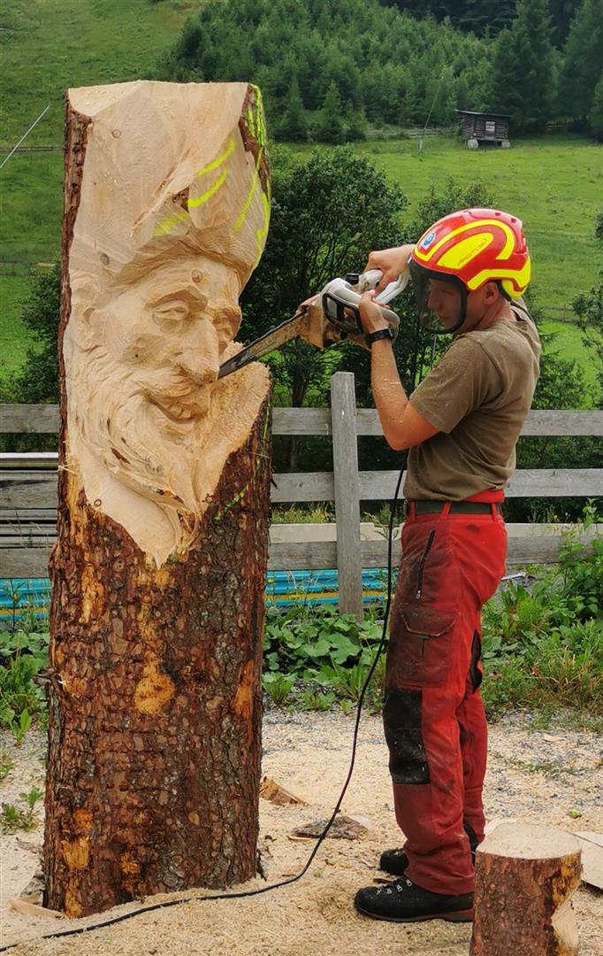 Kalchschmid beim Fertigen von Holzskulpturen mit der Motorsäge über die Schulter schauen.