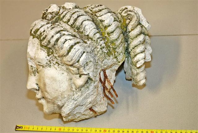 Nach Auskunft des gerichtlich beeideten Sachverständigen gehört dieser Kopf zu einer Statue aus dem 18.- 19. Jh. und es ist auf Grund der grünen Moosrückstände davon auszugehen, dass es sich dabei um eine Brunnenfigur handelt. Die dazu passende Statue würde zwischen 120 cm ((sitzend) und 150 cm (stehend) messen und könnte eine Liebesfigur darstellen.