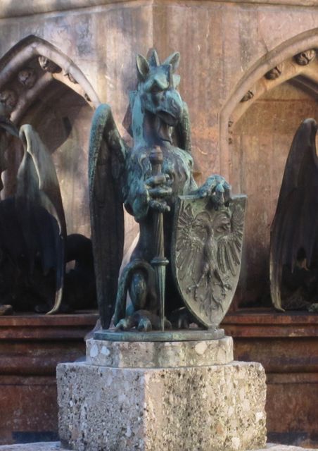 BU (v.ob.): Greif mit gestohlener Standarte, Greif mit Standarte (vom Rudolfsbrunnen in Innsbruck)