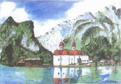 Beschreibung Gemälde "Königssee": Beize / Papier mit Holzrahmen; 30 x 40 cm; Emira Kirchebner, 2002.
