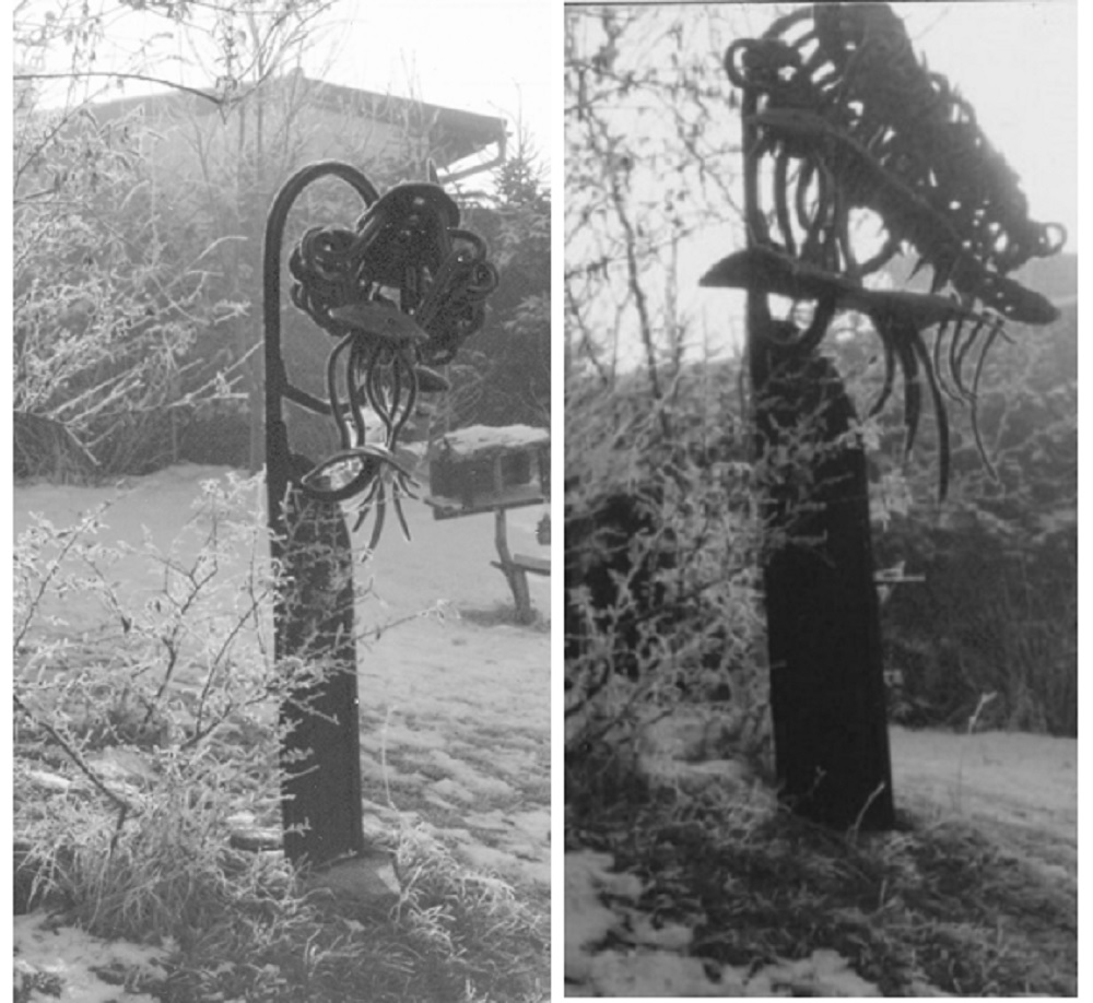 Beschreibung "Skulptur": einer Egge ähnelnde Statue; Eisenteile verschweißt bzw. gesteckt, ehemals schwarz lackiert, jetzt zu 60% rostig; Höhe ca. 160cm; Gewicht 60 - 80 kg; Ludwig Schwarz (1940 Bschlabs - 2007 Telfs), 1973.
