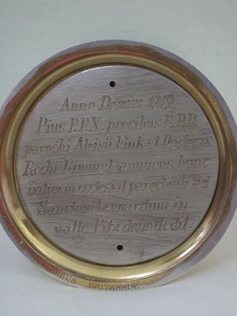 (1822-1896). An der Unterseite des Stehrandes graviert: ORA PRO MULIERIBUS BULIERIBUS BRITANNIAE. An der Unterseite gravierte Platte mit Stiftung an St.Leonhard im jahre 1909.
