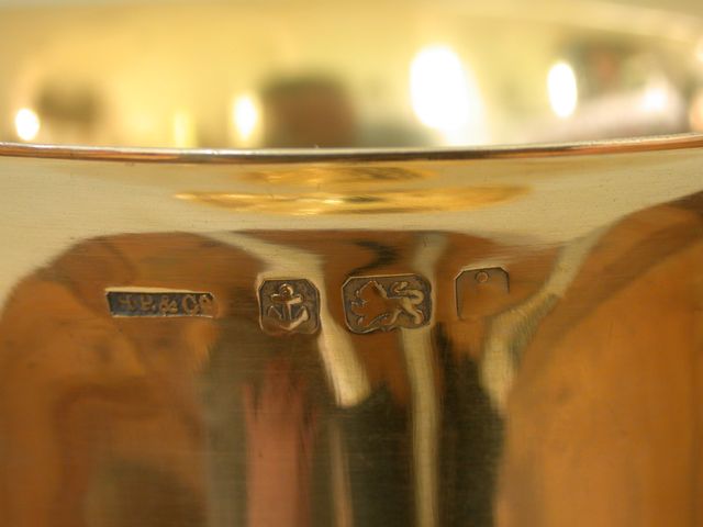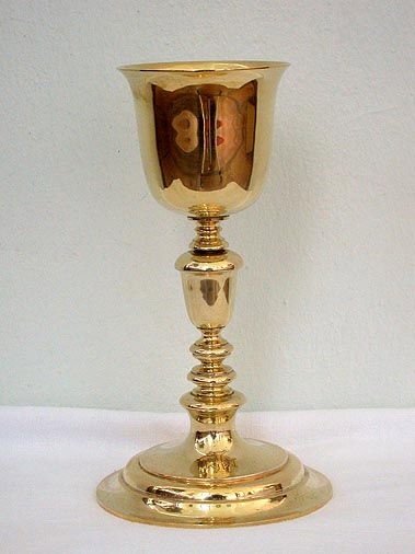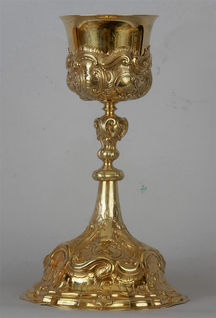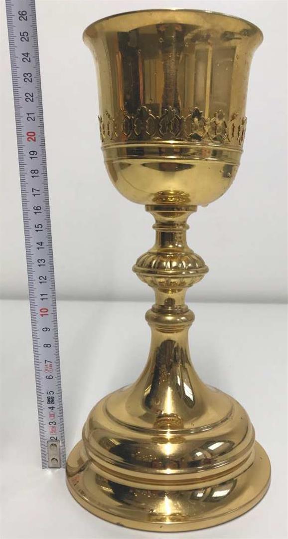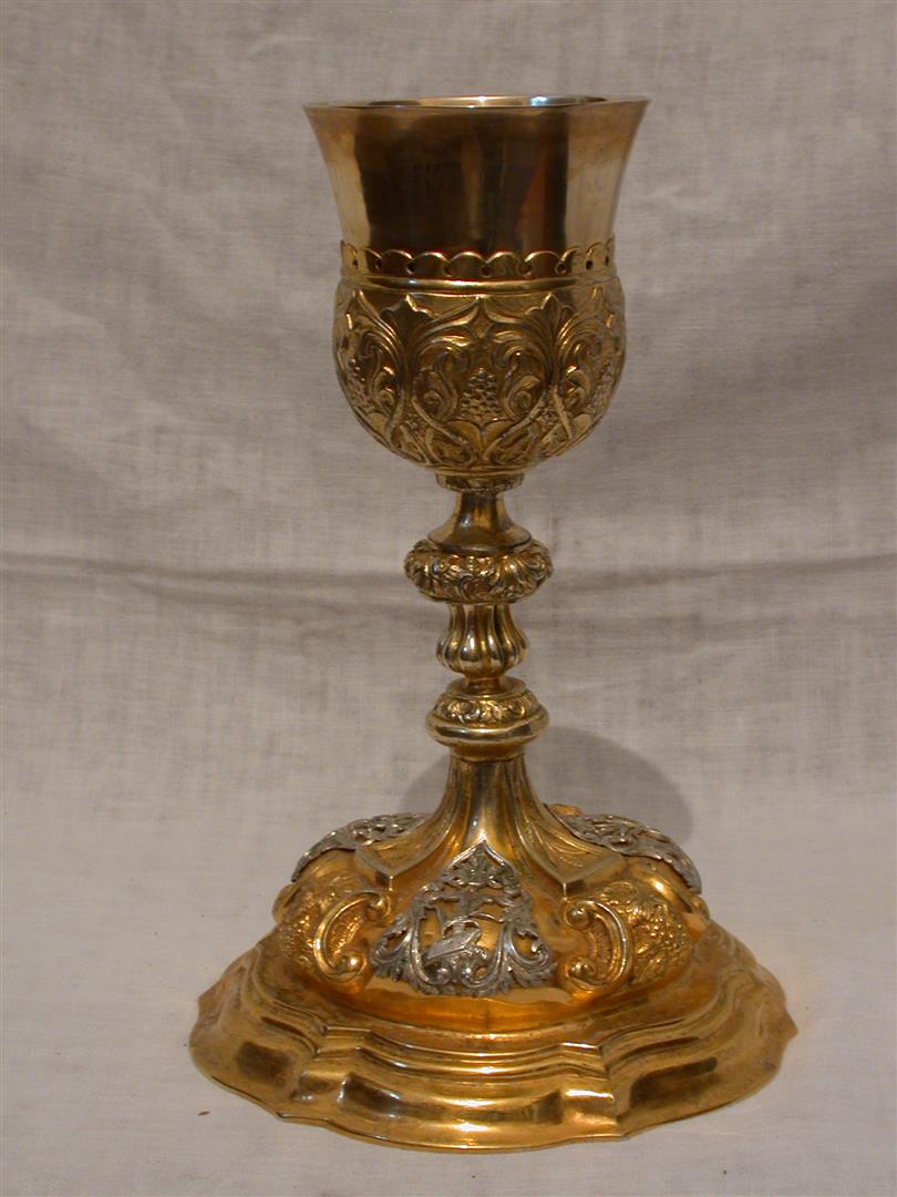 1) Beschreibung "Kelch": Silber vergoldet, Treibarbeit; Höhe 21,5 cm; 19.Jh.