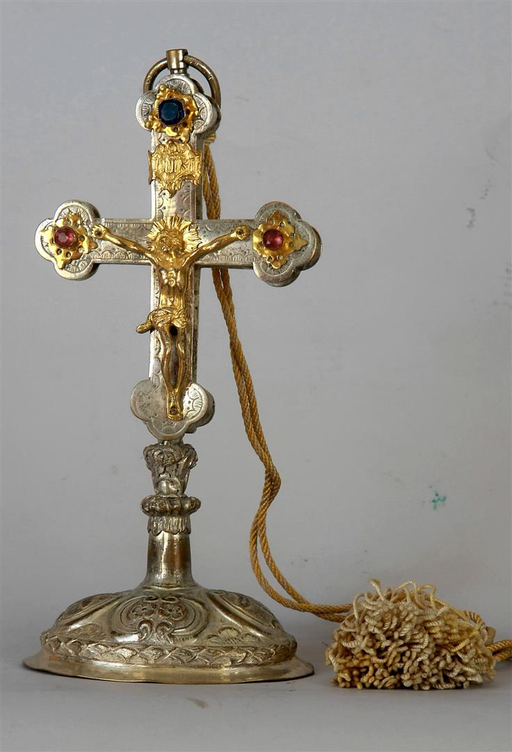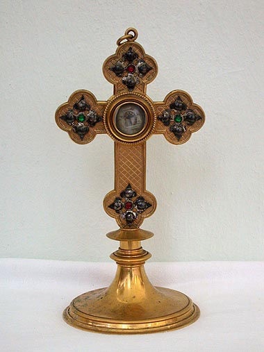 2) Beschreibung "Reliquienkreuz": Metallguss vergoldet, Pressarbeit; Maße 25 x 12 cm; Ende 19.Jh.