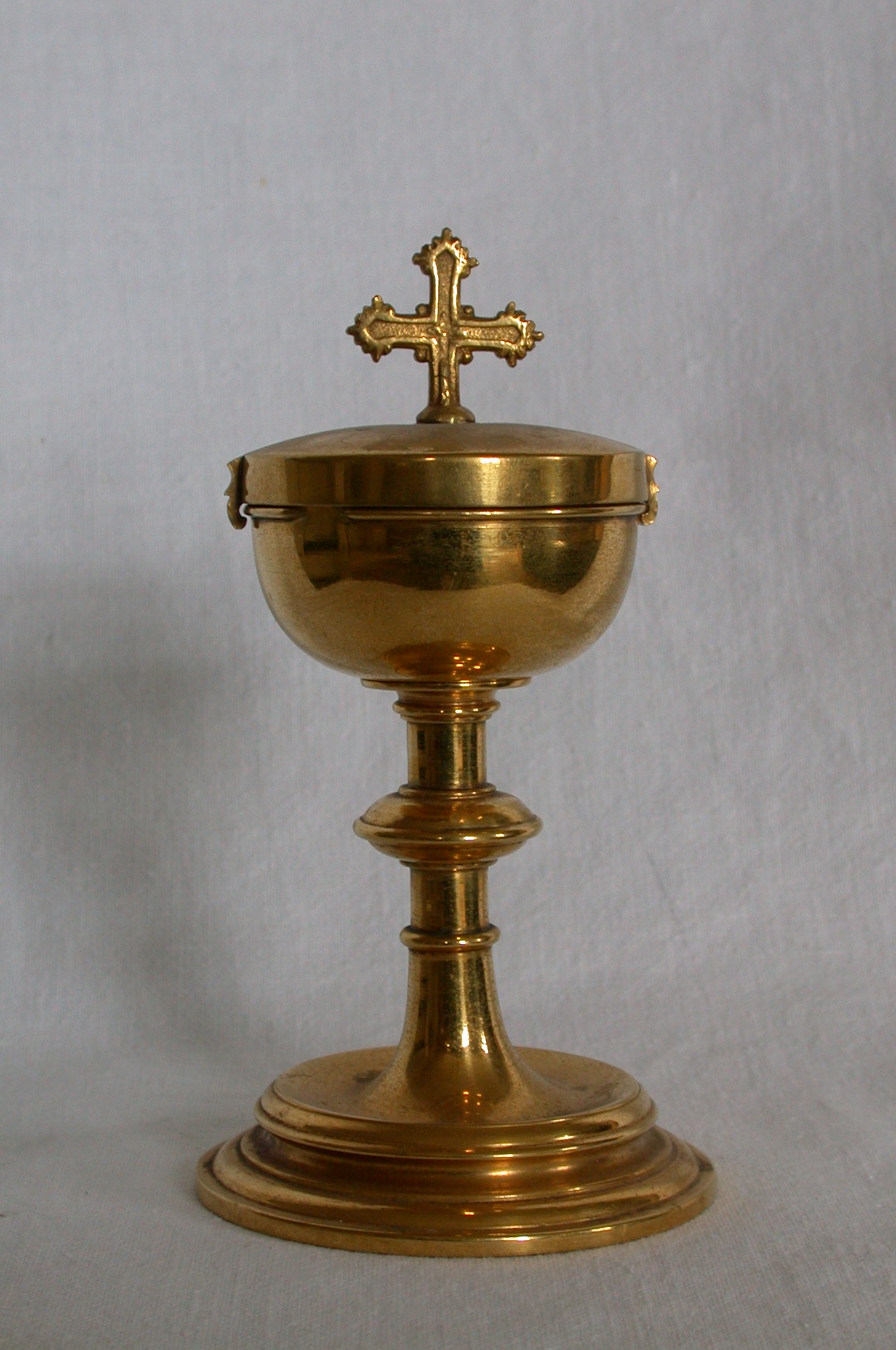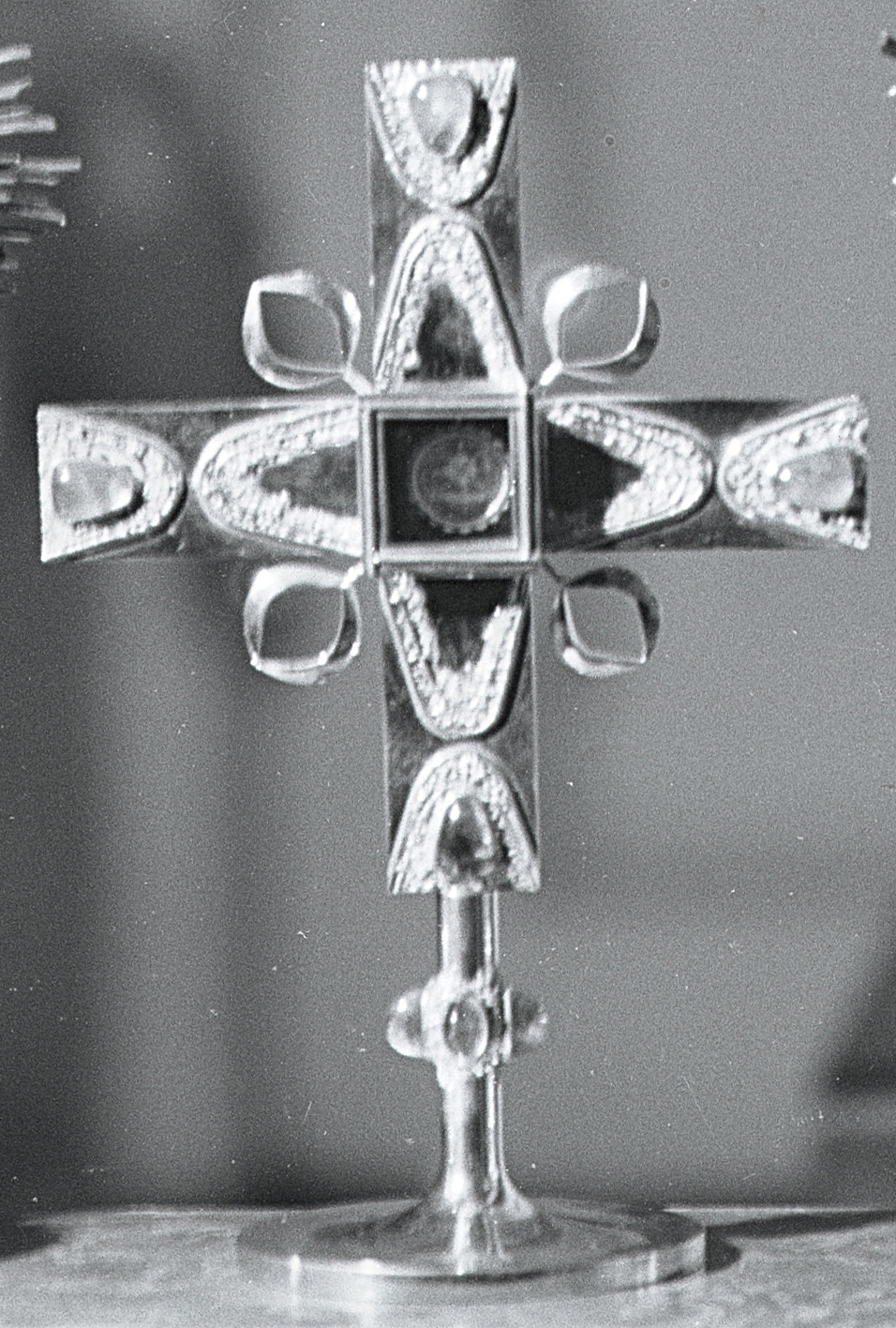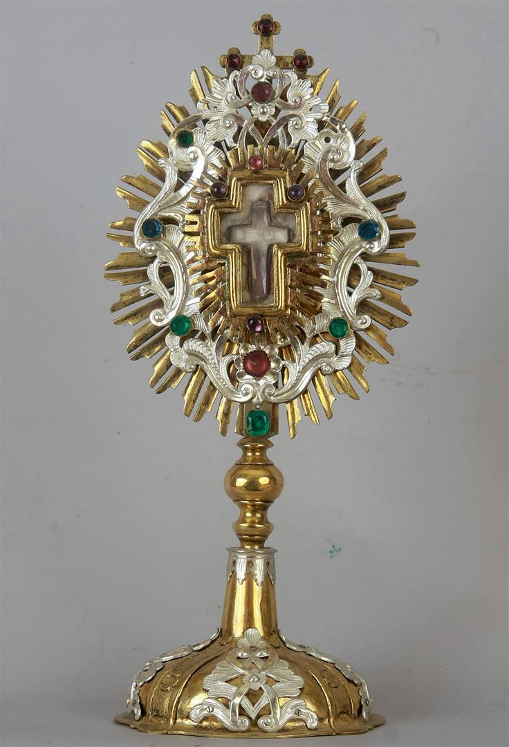 mit Dreipassenden samt applizierten Blattrosetten wie Schmucksteinbesatz bzw. starrem Gitterornament. Rundes Reliquienbehältnis samt Kapsel mit Kreuzpartikel.