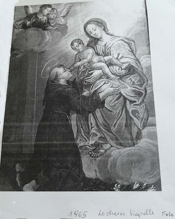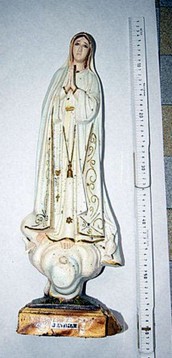 2) Der oder die Täter ließen am Tatort ein 138,5 x 0,70 cm großes Bild (ein sogenanntes "Schlafzimmerbild"; Öldruck im Breitformat) mit der Darstellung "Maria mit Kind und Josef" (Heilige Familie) mit Holzrahmen zurück. Dieses Bild stammt mit hoher Wahrscheinlichkeit von einem anderen Dieb- oder Einbruchsdiebstahl. Vermutlich haben sie es aus Platzmangel zurück gelassen oder beim Einladen der Statue vergessen.