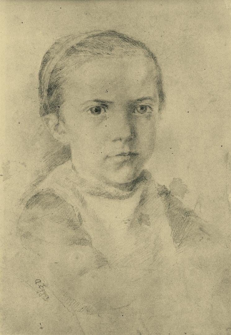 Halbporträt einer Dame mittleren Alters im Profil nach rechts gedreht, in einem schwarzen langärmeligen Kleid mit weißem Musselinkragen (?) und weißem, zart bestickten Schultertuch aus Musselin. Sie trägt ihr braunes Haar über einen Mittelscheitel eng am Kopf anliegend und nach hinten frisiert. Die Arme sind abgewinkelt eng am Körper anliegend, die beiden Hände unterhalb der Brust und über dem Schultertuch überkreuzt. Lange Ohrgehänge, Brosche (?) über dem Halsgrübchen. Rechts am Bildrand eine Ablage mit einem geschlossenen Buch darauf.