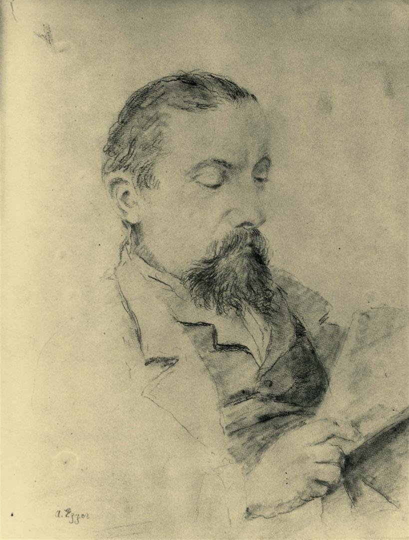 Halbporträt eines Mannes mittleren Alters im Profil schräg nach links gedreht, den Kopf zur linken Schulter (auf die rechte Bildseite) gewandt. Er trägt unter dem dunklen Herrenrock ein weißes Hemd mit Spitzenjabot und Spitzenmanschetten. Das Haar ist in Locken gedreht und erinnert an eine Rokoko-Perücke. Beide Arme sind abgewinkelt vom Körper gestreckt, die linke Hand ruht in der Mitte, mit dem rechten Ellbogen stützt er sich auf einer Marmorunterlage ab, auf der ein geöffnetes Buch aufliegt. Mit den drei Fingern seiner rechten Hand hält der Mann eine Gänsefeder zum Schreiben.