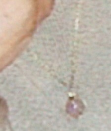 Halbporträt einer Frau mittleren Alters im Profil schräg nach rechts gedreht in einem dunklen, kurzärmeligen, rund ausgeschnittenen Empire-Kleid (mit hellem Schnürband unter der Brust). Blondes onduliertes Haar, nach den Stirnfransen hoch am Hinterkopf aufgesteckt, zwei Haarsträhnen fallen offen auf die rechte Schulter herab. Die Schmuckstücke bestehen aus einer eng anliegenden, fünfreihigen Halskette und einem breiten Ring am rechten Ringfinger. Beide Arme sind abgewinkelt und ausgestreckt, in beiden Händen hält sie einen Gegenstand (Täschchen ?). Auf den rechten Bildrand gestellt eine Ablage aus Marmor.