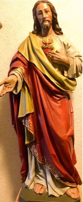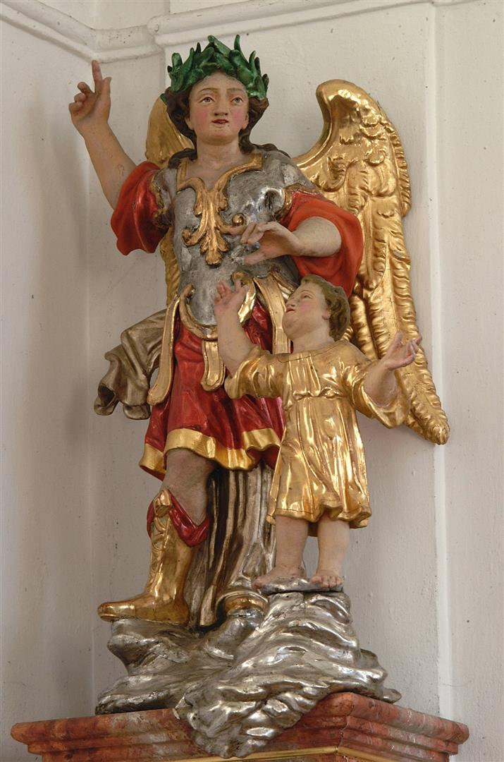 1) Beschreibung Skulptur "Hl. Michael": Holt geschnitzt gefasst; Höhe ca. 120 cm; beide Arme fehlen (ab der Schulter).