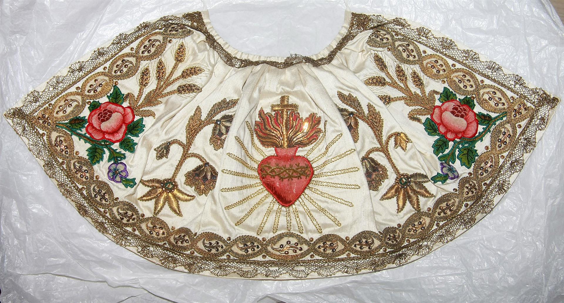 Beschreibung "Krone Mariae": Silberblech getrieben, tlw. vergoldet, gefasste bunte Glassteine / Halbedelsteine.
