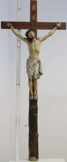Beschreibung "Kruzifix": Maße 125x52 cm. Holz, geschnitzt, gefasst. Leichte Beschädigungen (u.a. fehlende Finger; Farbabsplitterungen). Kreuzbalken aus einem natürlichen dunkelbraun gefärbten runden Baumstamm (unten) in Höhe der Füße Christi in gezimmerte mittelbraune Balken übergehend. Titulus crucis oben fehlt (zwei hellere Flecken). Gekreuzigter im Viernagel-Typus geschnitzt, Korpus ohne Krümmung ("stehend"), weißes Lendentuch, vor der linken Hüfte in den Strick eingeschlagen. Kopf leicht zur rechten Schulter geneigt, Blick nach oben gerichtet.
